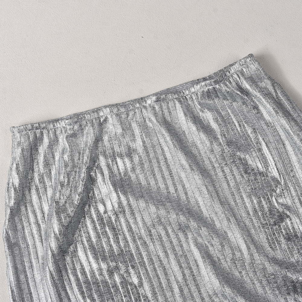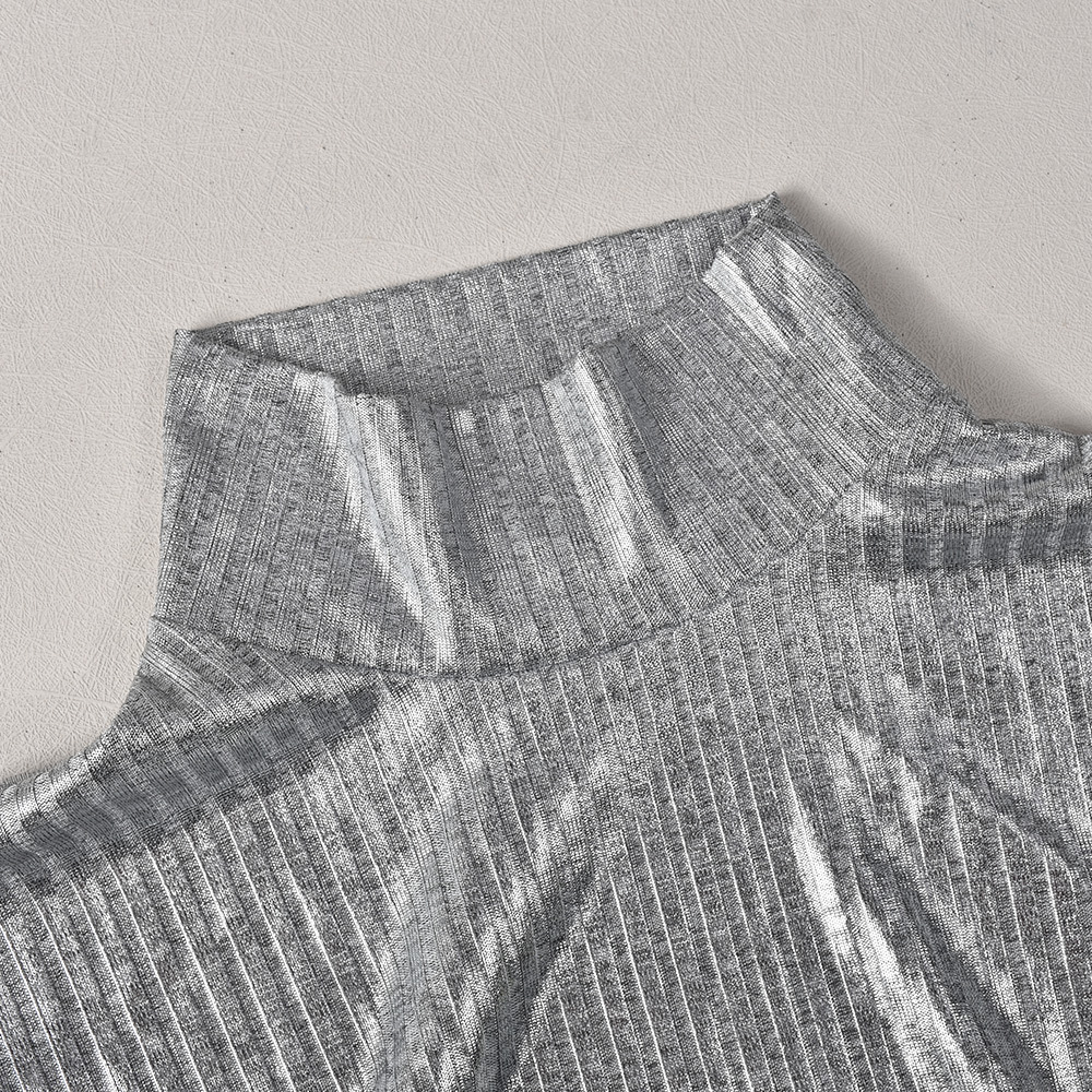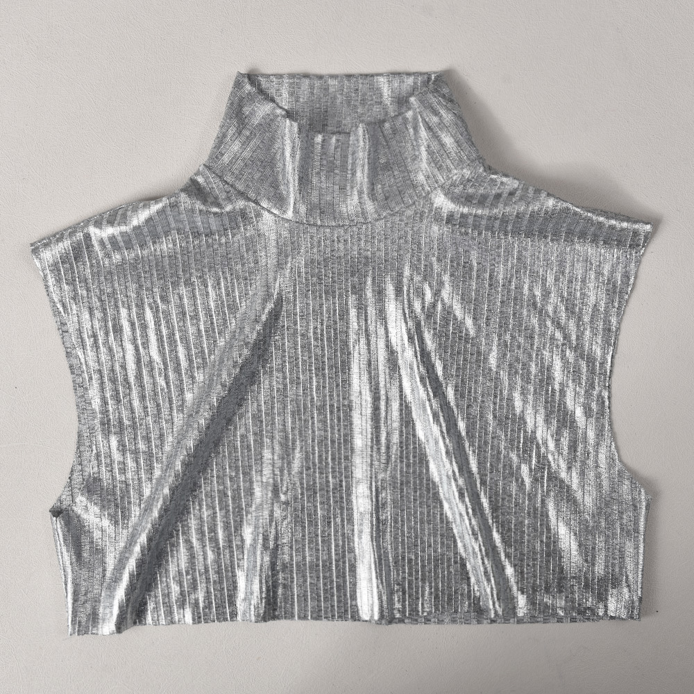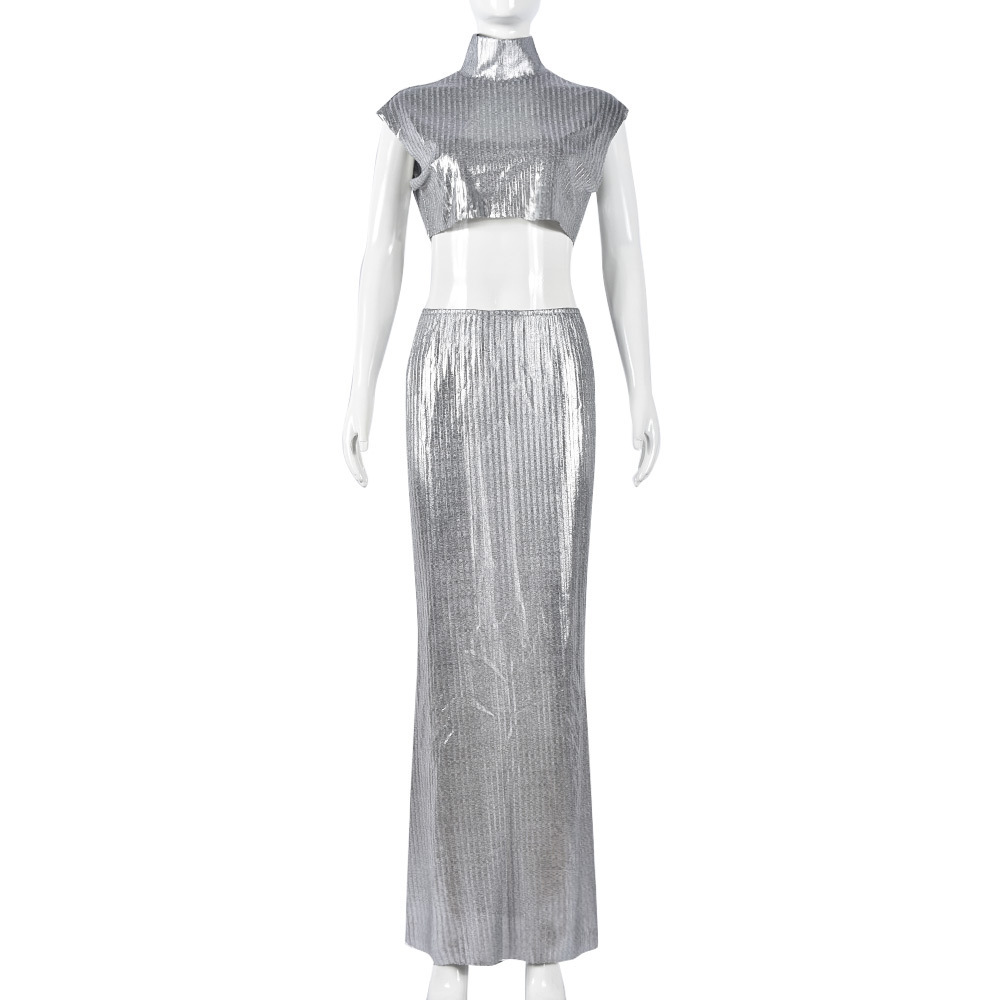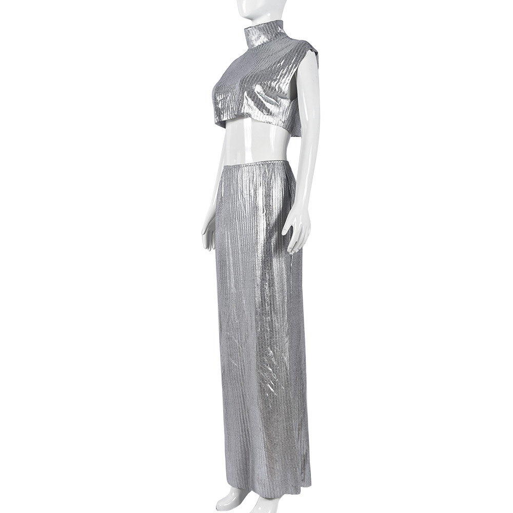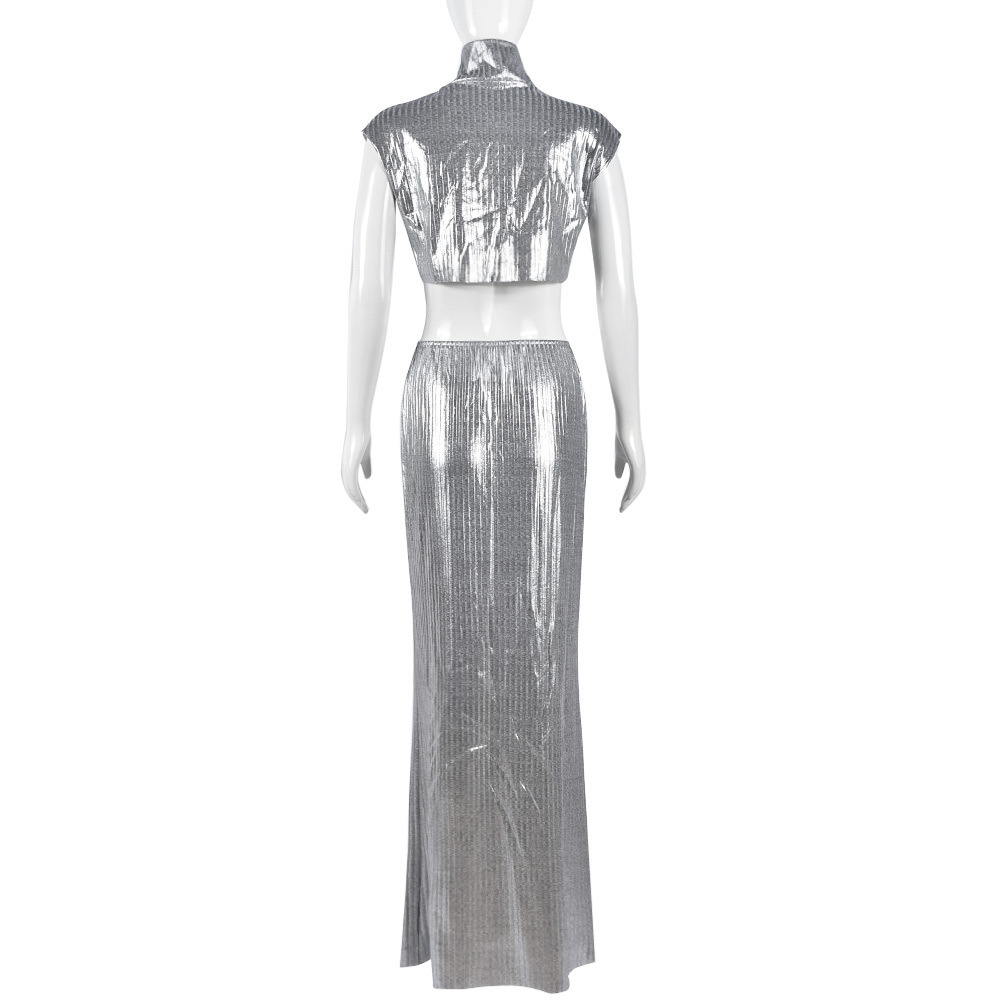 Autumn Sexy Metallic Coated Fabric Cropped Sleeveless Turtleneck Metal Skirt Set Women