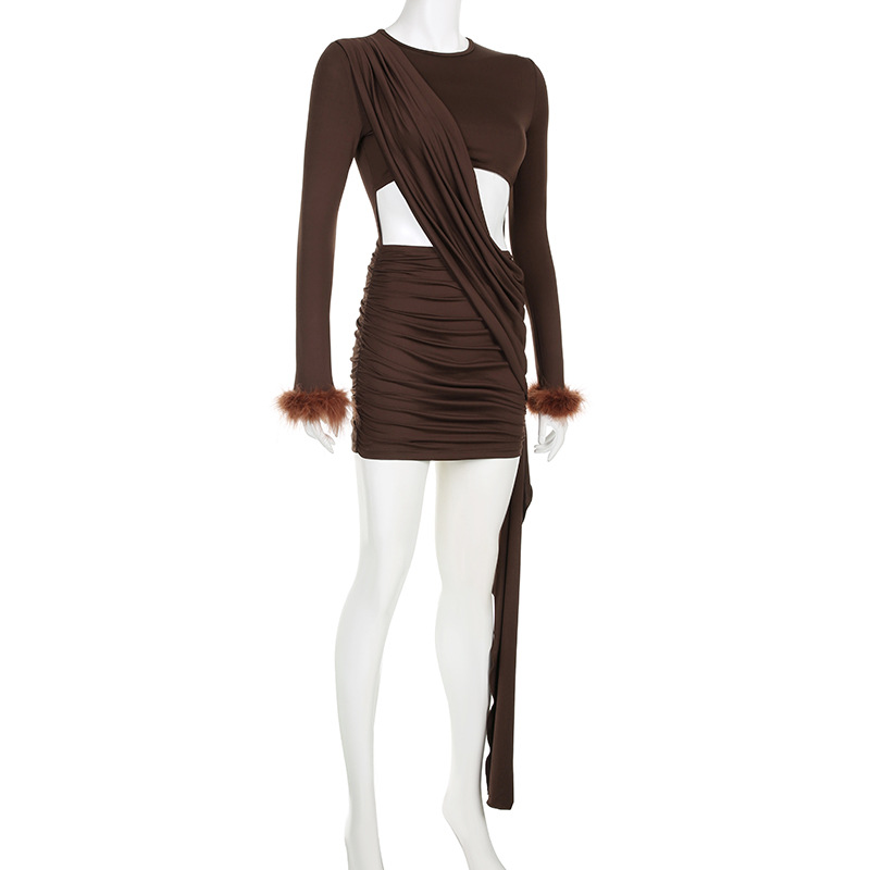 Autumn Winter Furry Long Sleeve Irregular Asymmetric Hollow Out Cutout Ruffle Hip Short Basic Elegant Dress