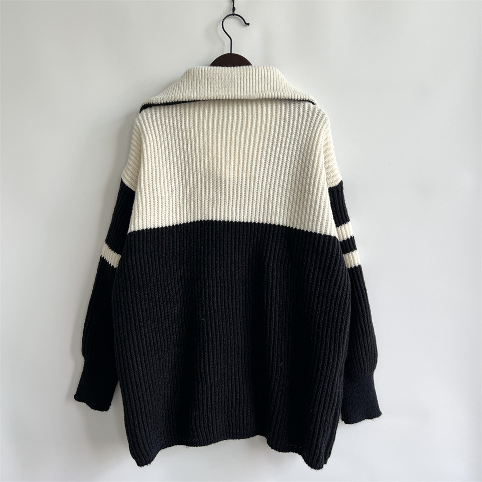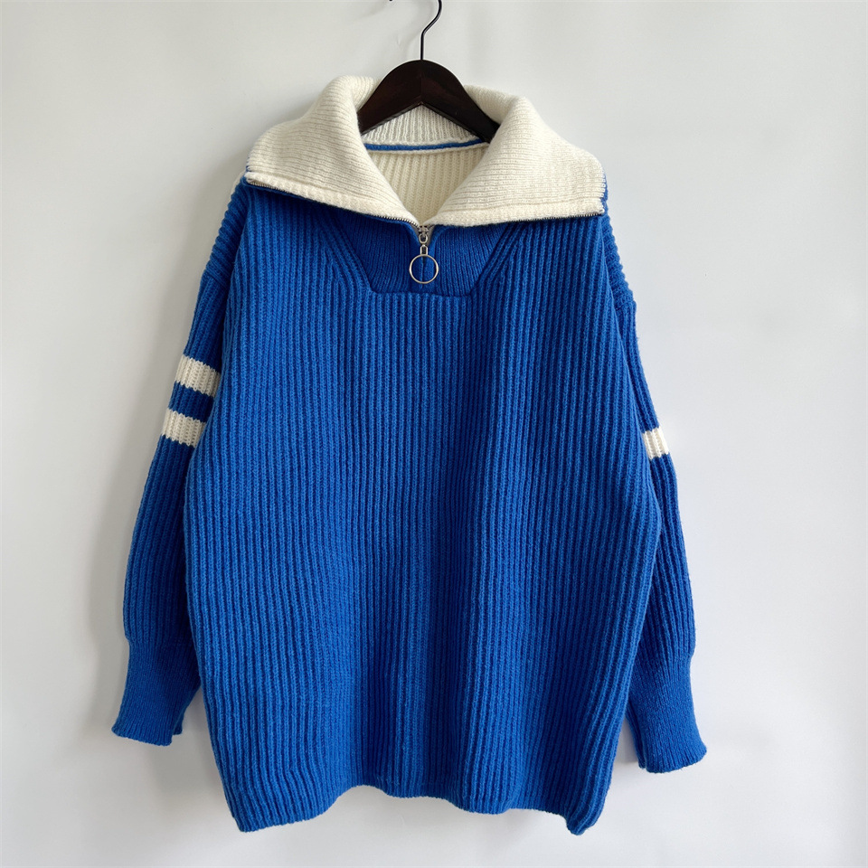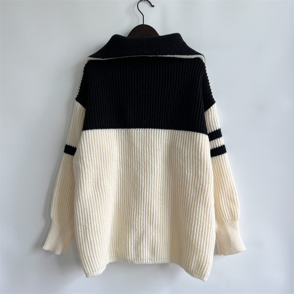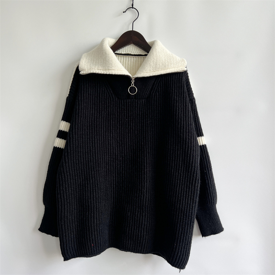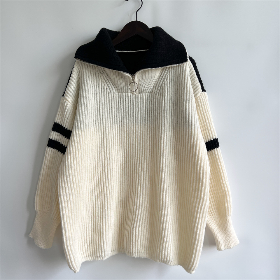 Autumn Winter Loose Casual Zipper Collared Arm Striped Knitted Sweater Pullover Sweater