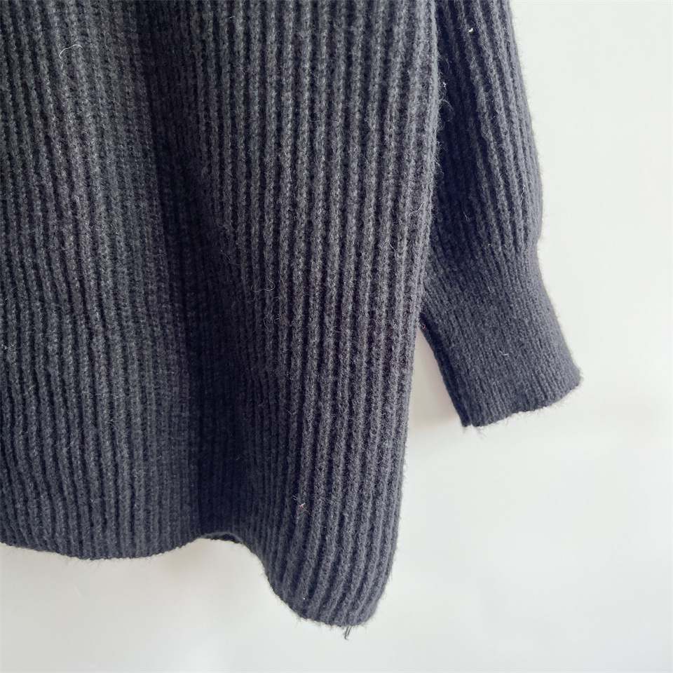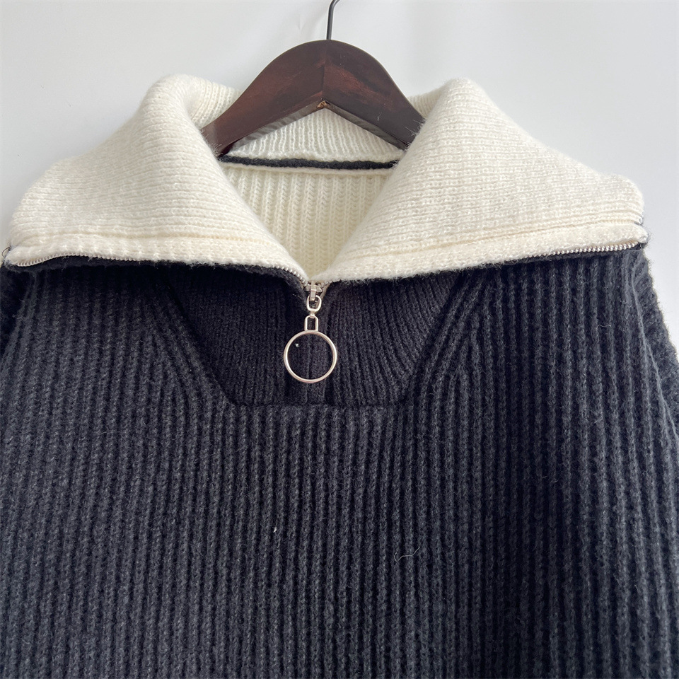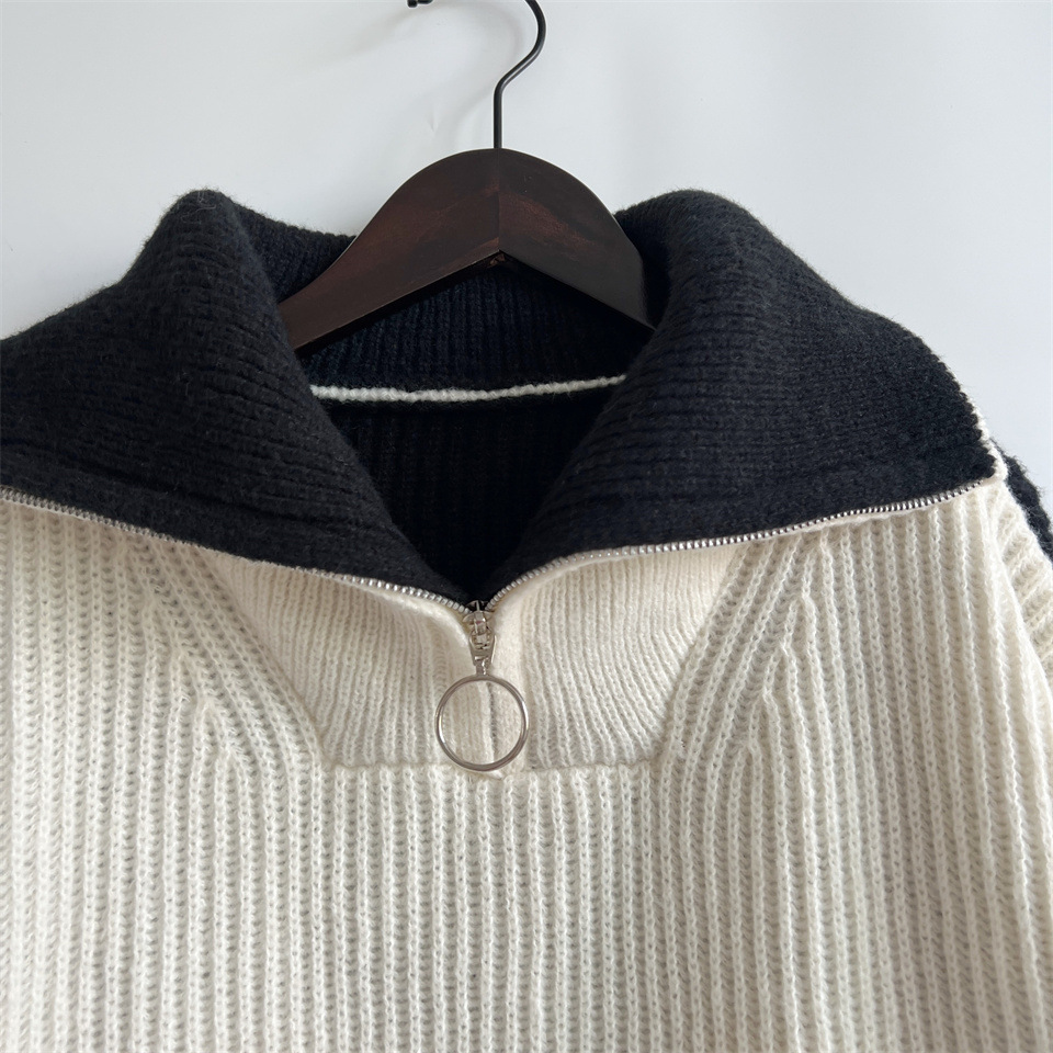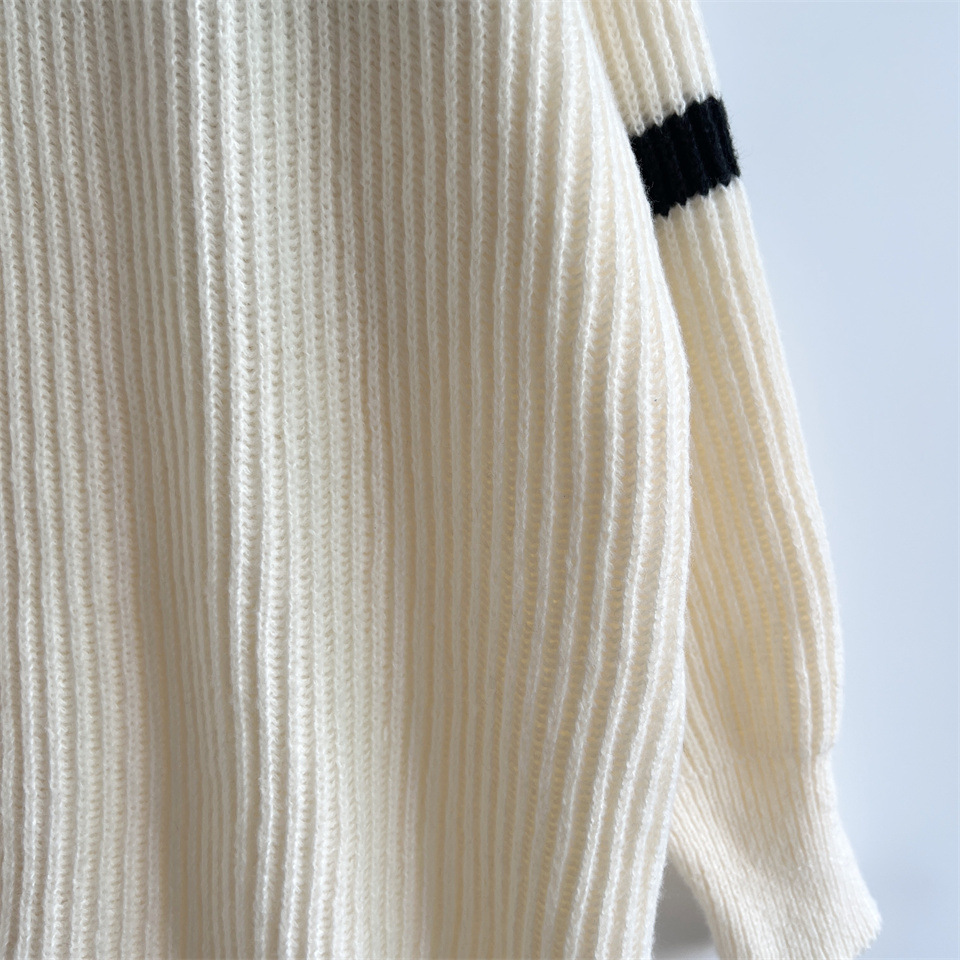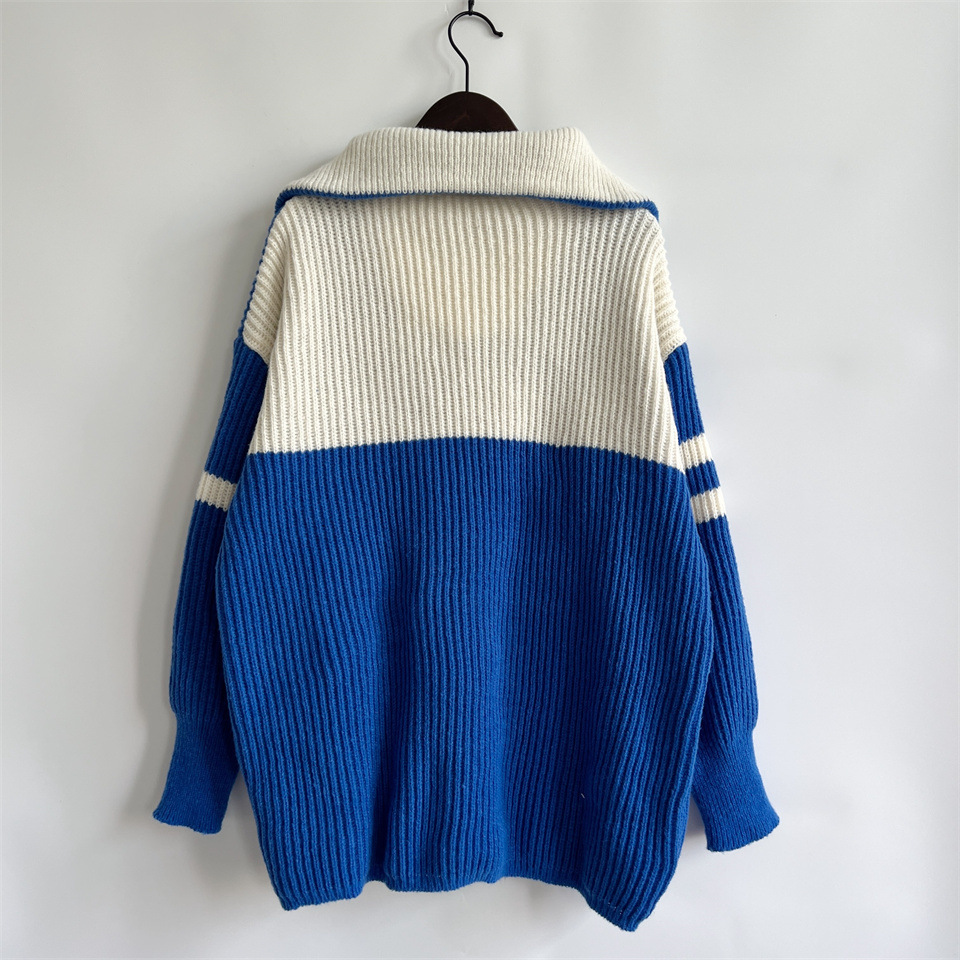Autumn Winter Loose Casual Zipper Collared Arm Striped Knitted Sweater Pullover Sweater