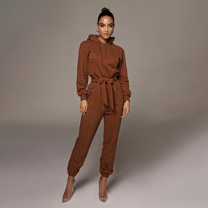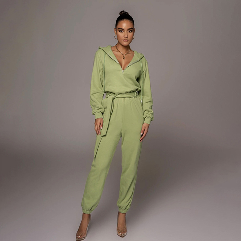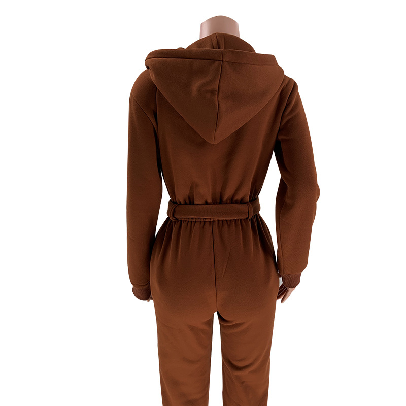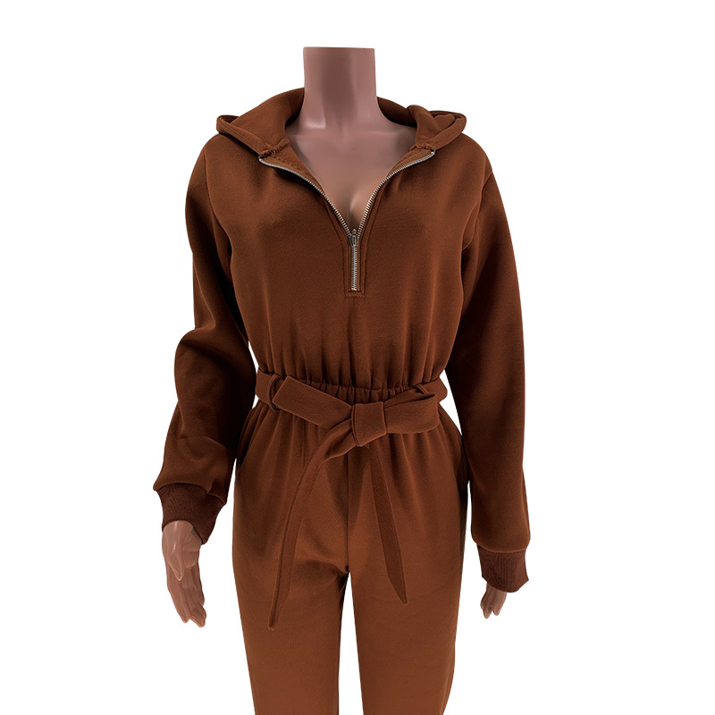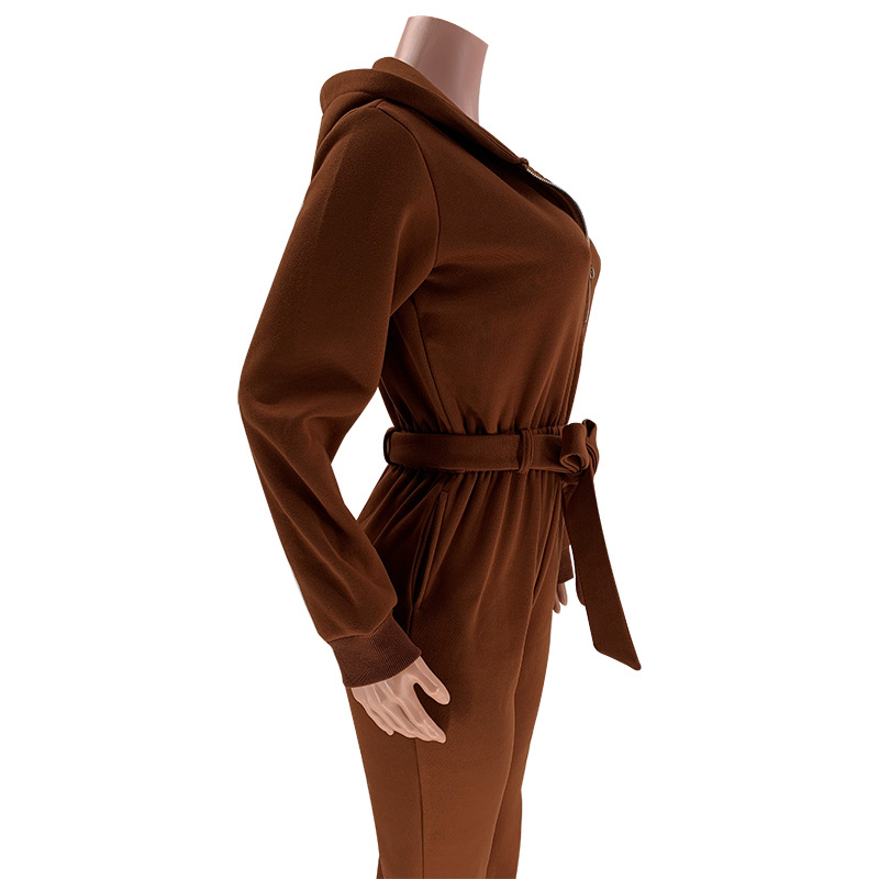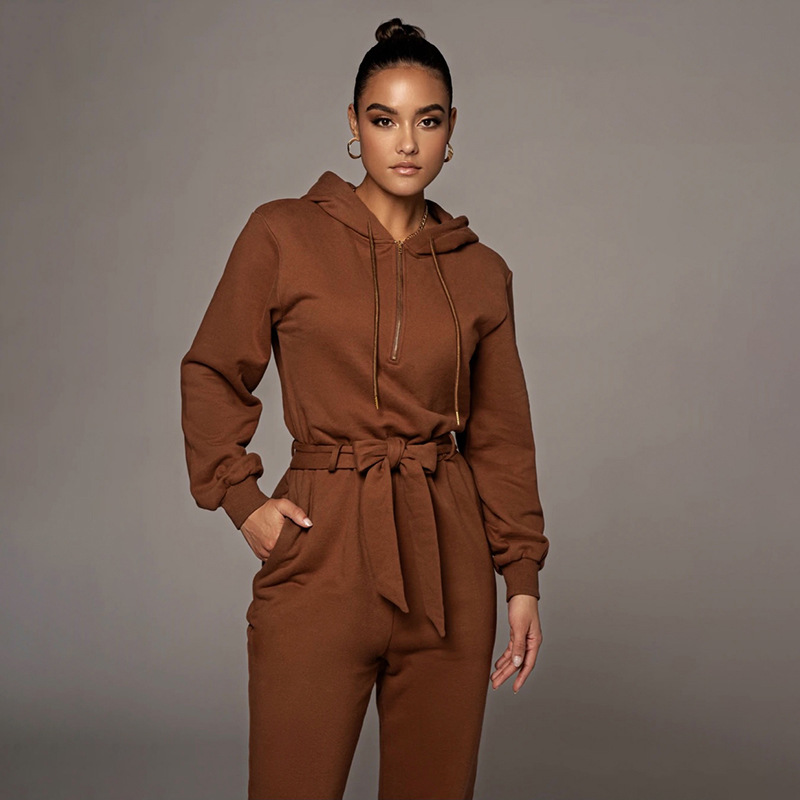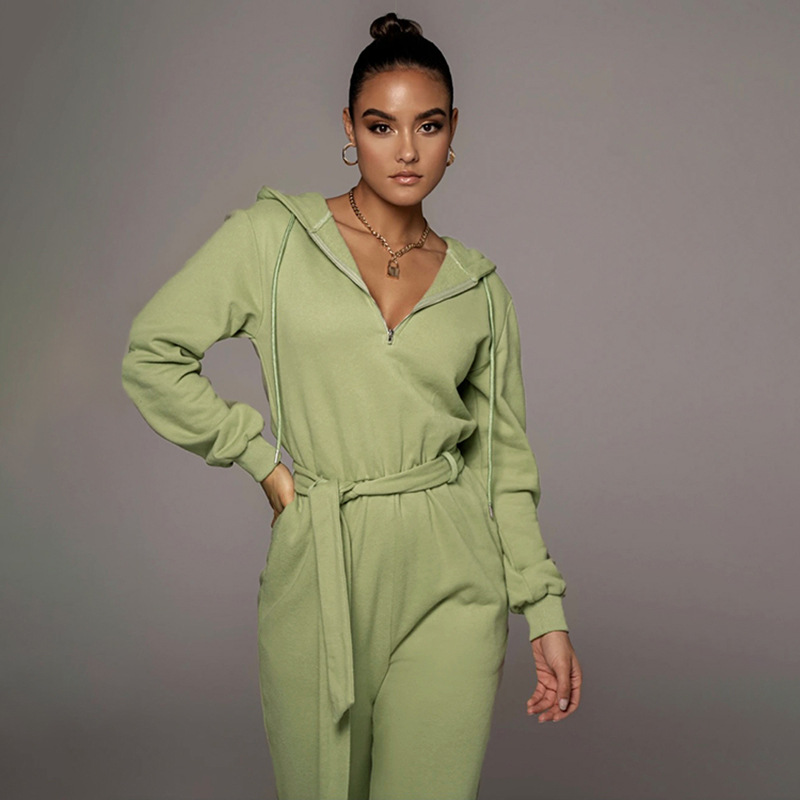Autumn Winter Slim Fit Long Sleeve Solid Color Hooded Half Open Collar Urban Casual Women Jumpsuit