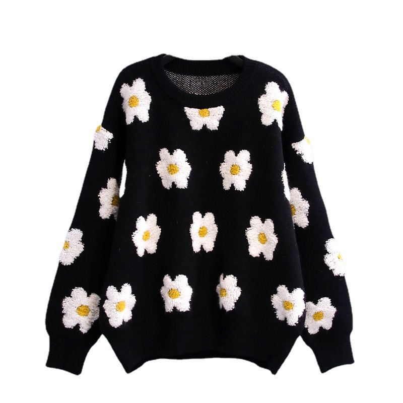 Autumn Winter Three Dimensional Little Daisy Thickened Black White Contrast Color Knitted Sweater Pullover for Women