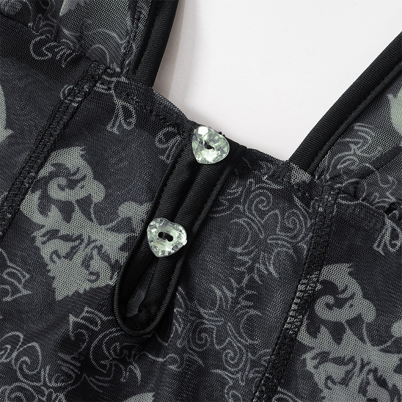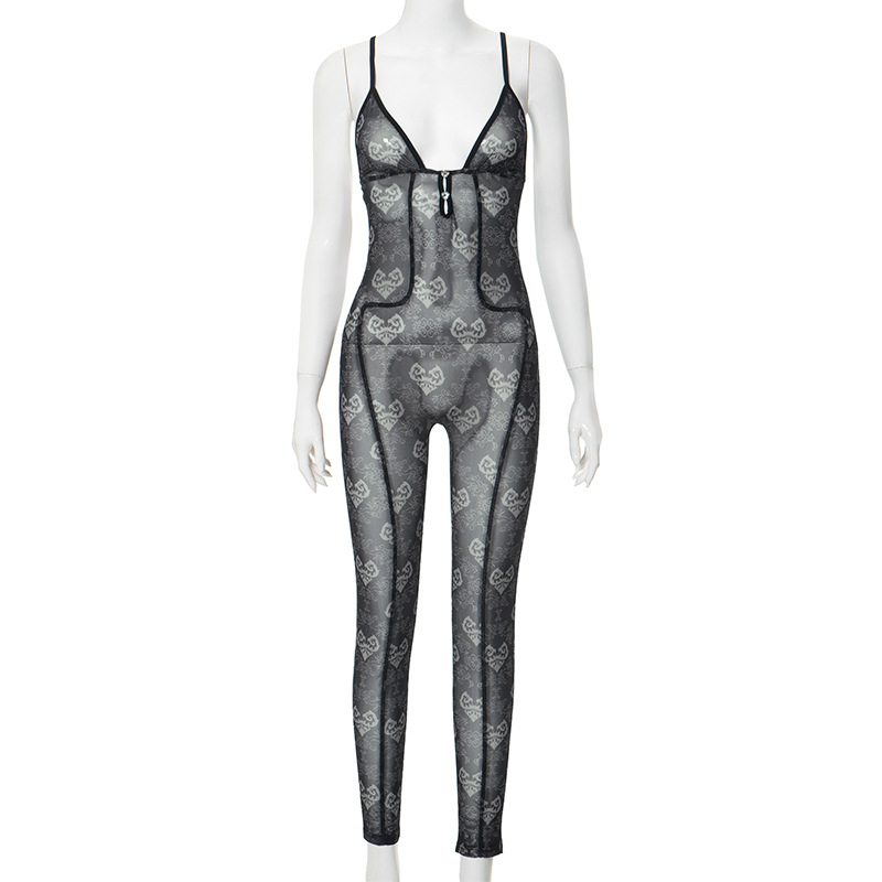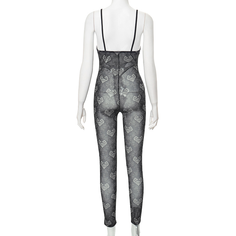 Chic Women Clothing Spring Sexy Mesh Floral Print Hollow Out Cutout Out Sleeveless Backless Suspender One Piece Trousers