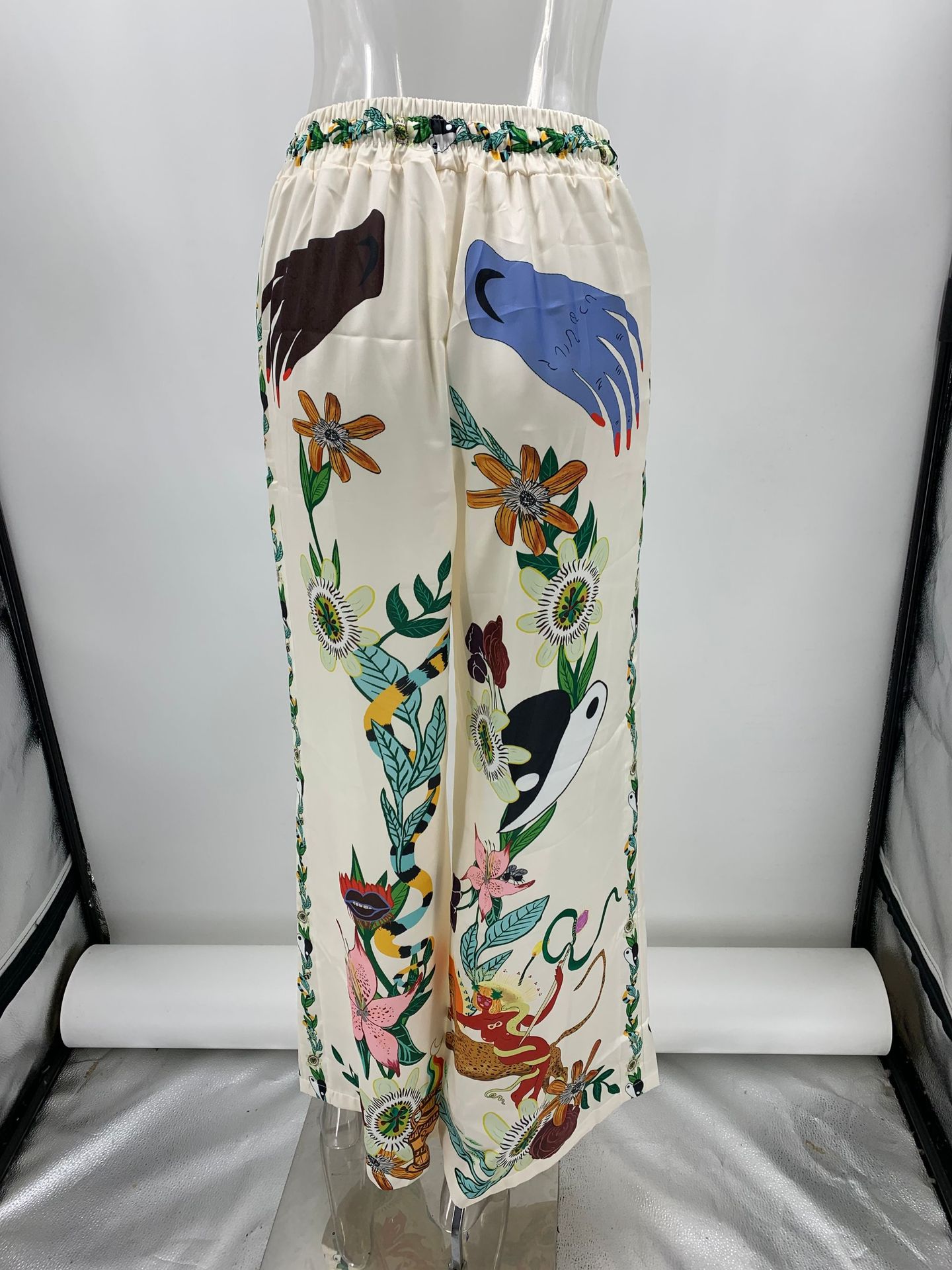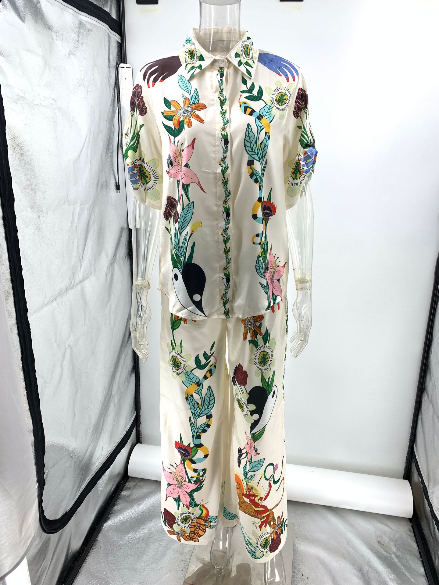 Graffiti Printing Satin Short Sleeved Collared Shirt Trousers Casual Two Piece Suit