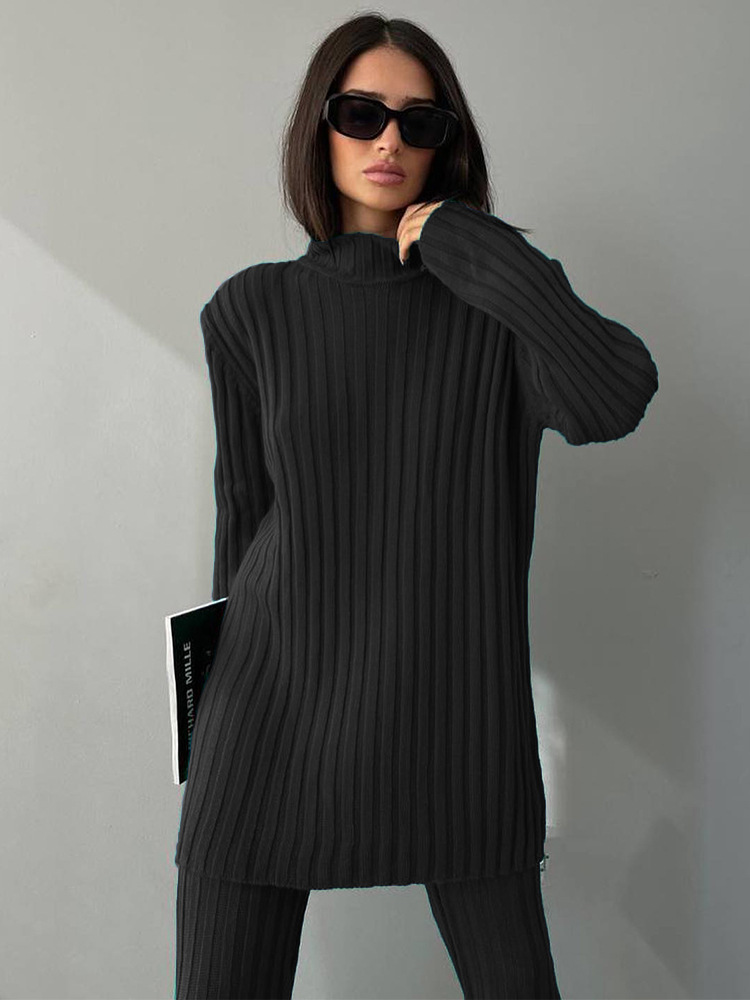 High Neck Ribbing Knitting Set Women Autumn Winter Pullover Sweater Pants Woolen Two Piece Set