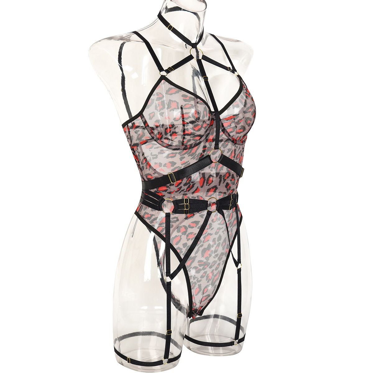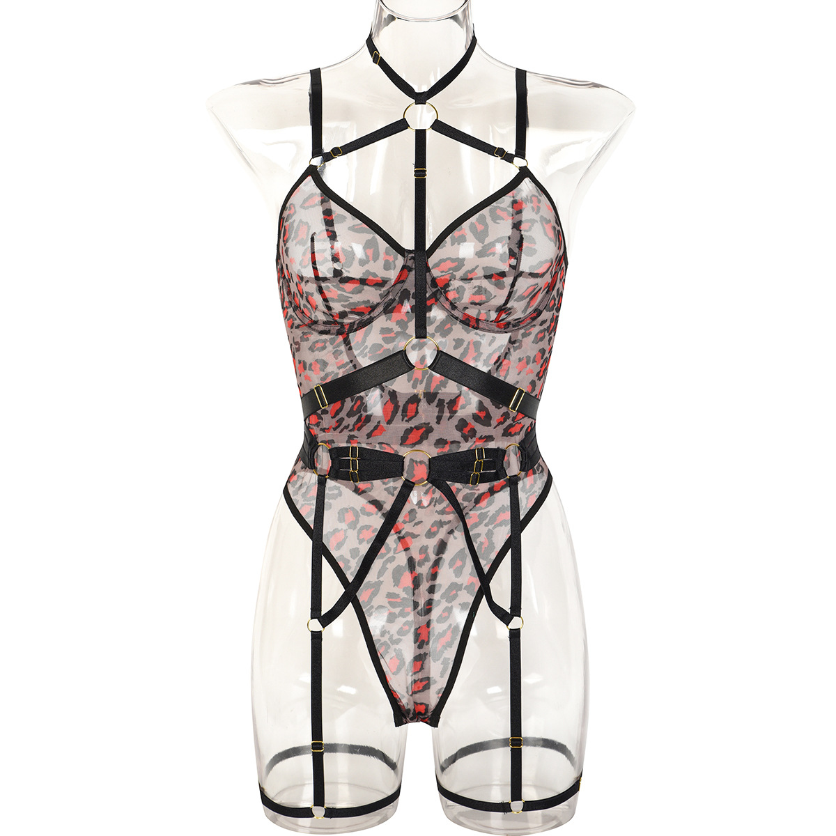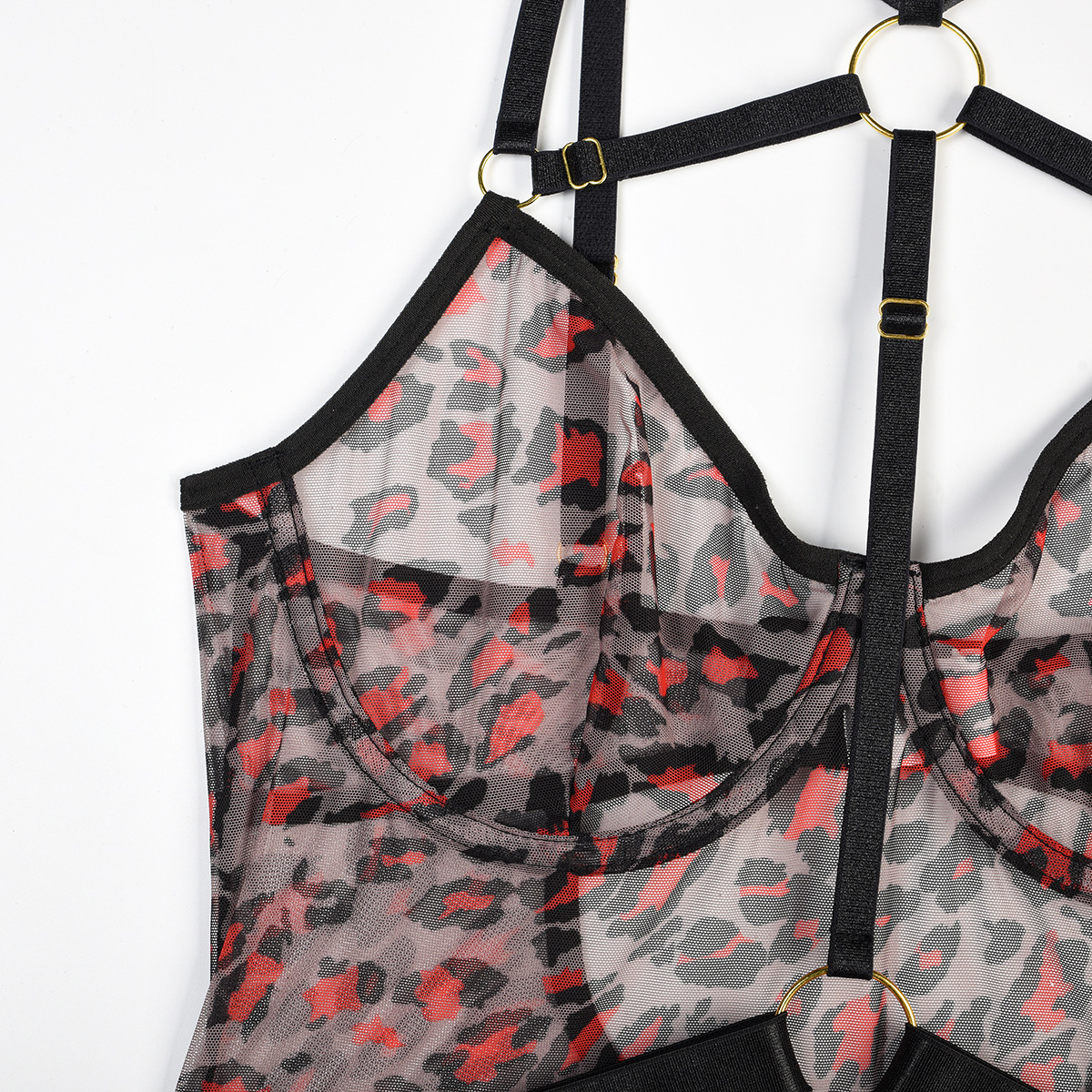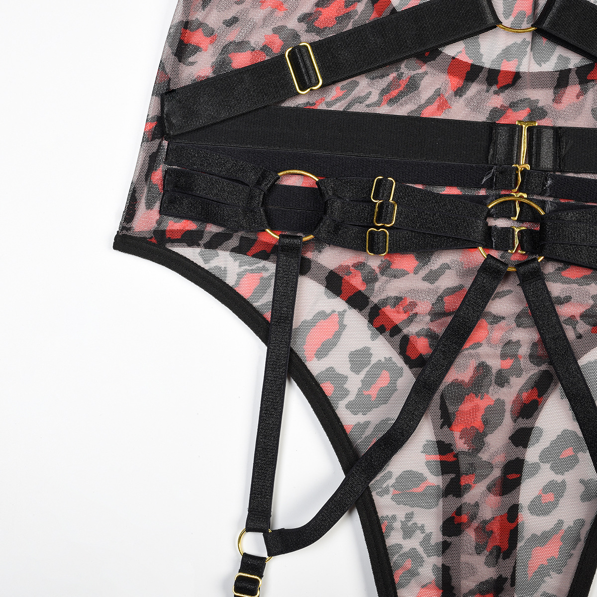 Leopard Print Sheer Mesh Strap Sexy Lingerie with Steel Ring Sexy Bodybuilding Jumpsuit
