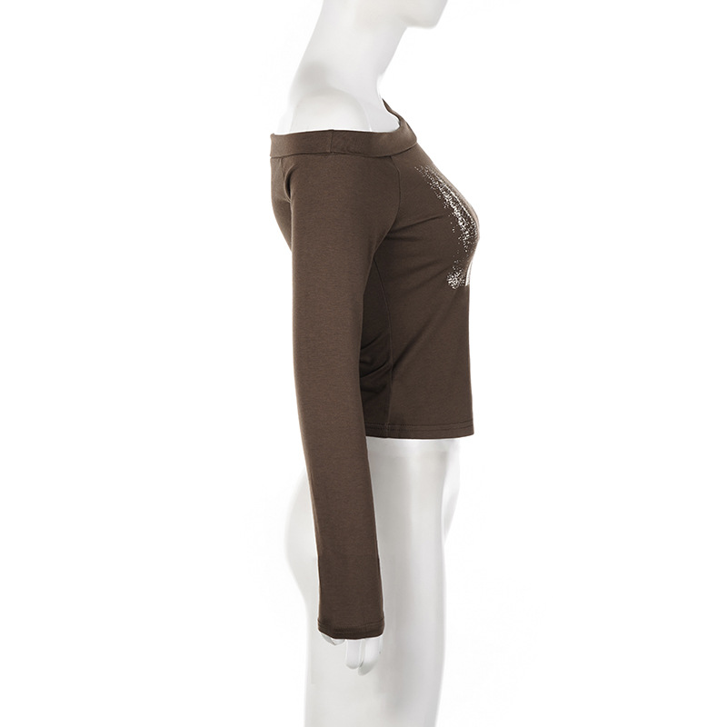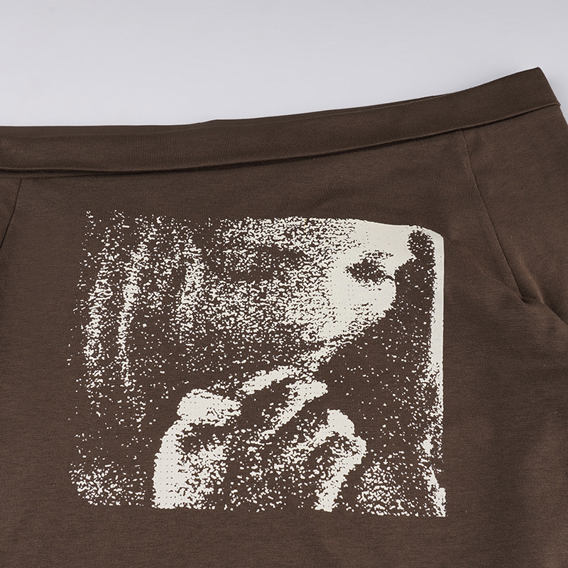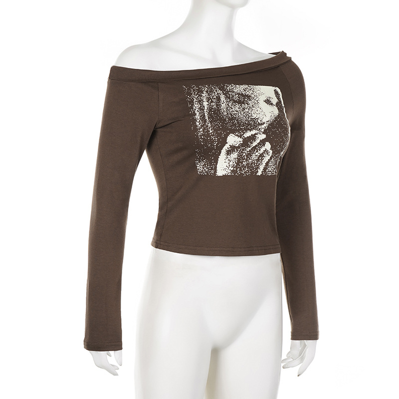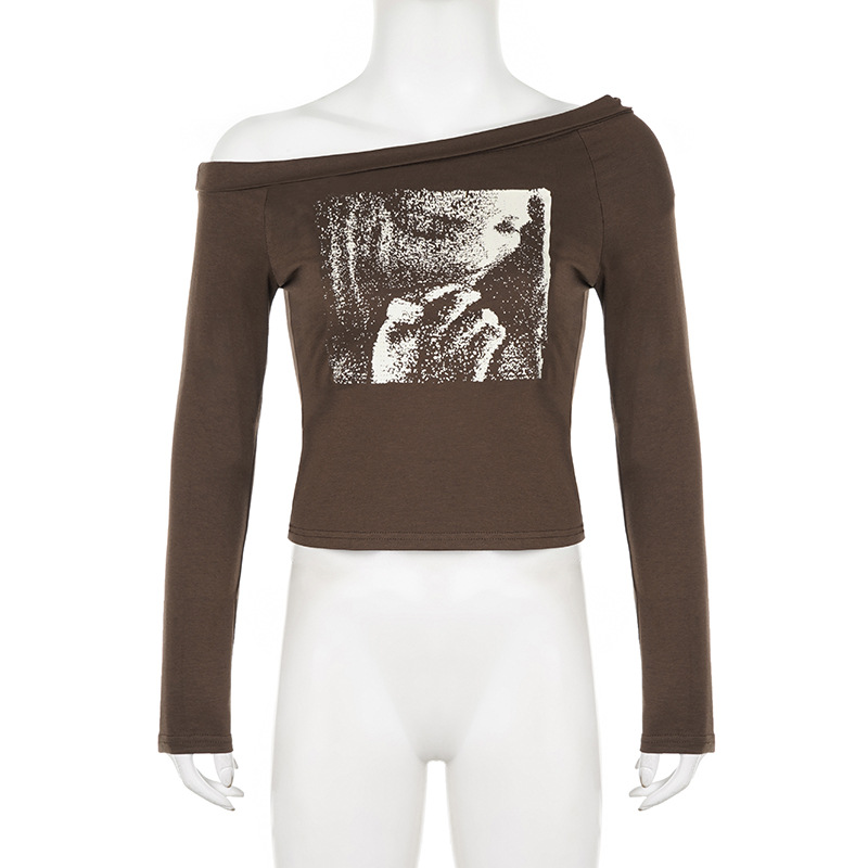 Niche Retro Figure Avatar Printed Sexy Diagonal Collar Slim Fit Base T shirt Sexy Irregular Asymmetric Casual Top