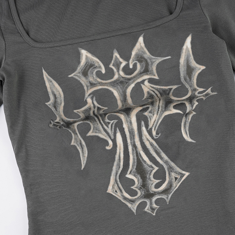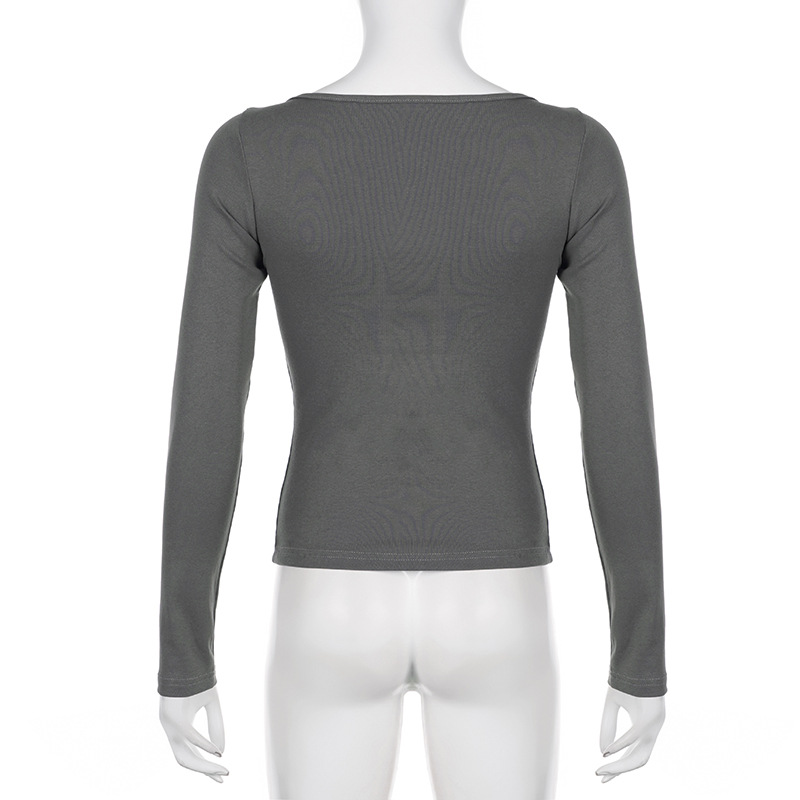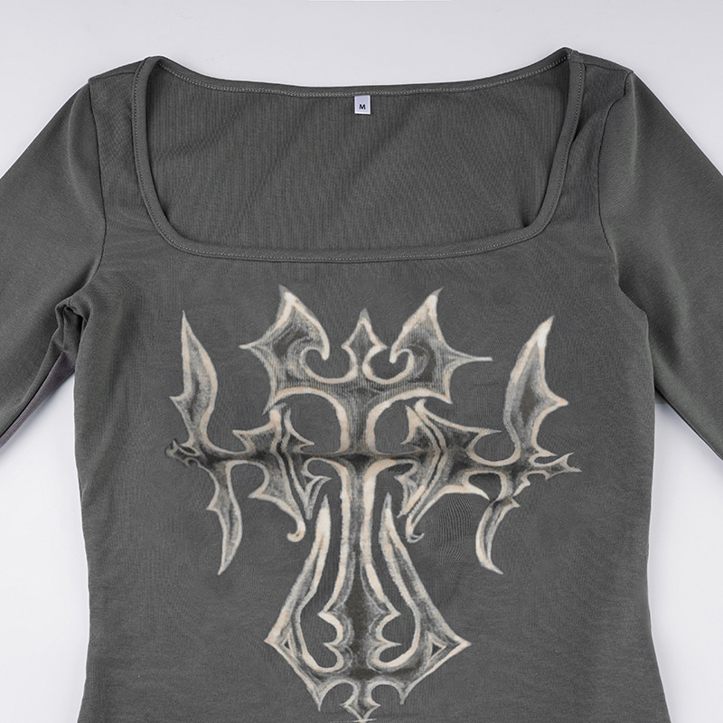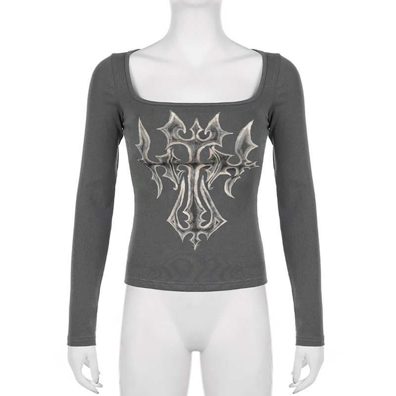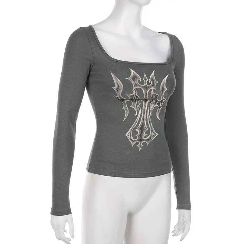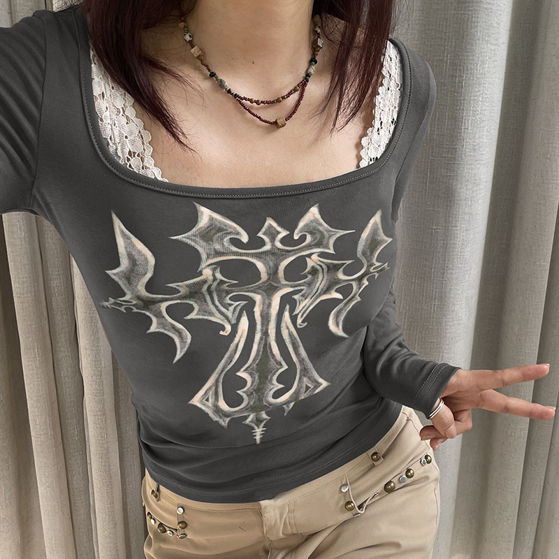 Niche Vintage Printed Gentle Square Collar Slim Fit Long Sleeved T shirt Early Autumn Sexy Push up Bottoming Sweater