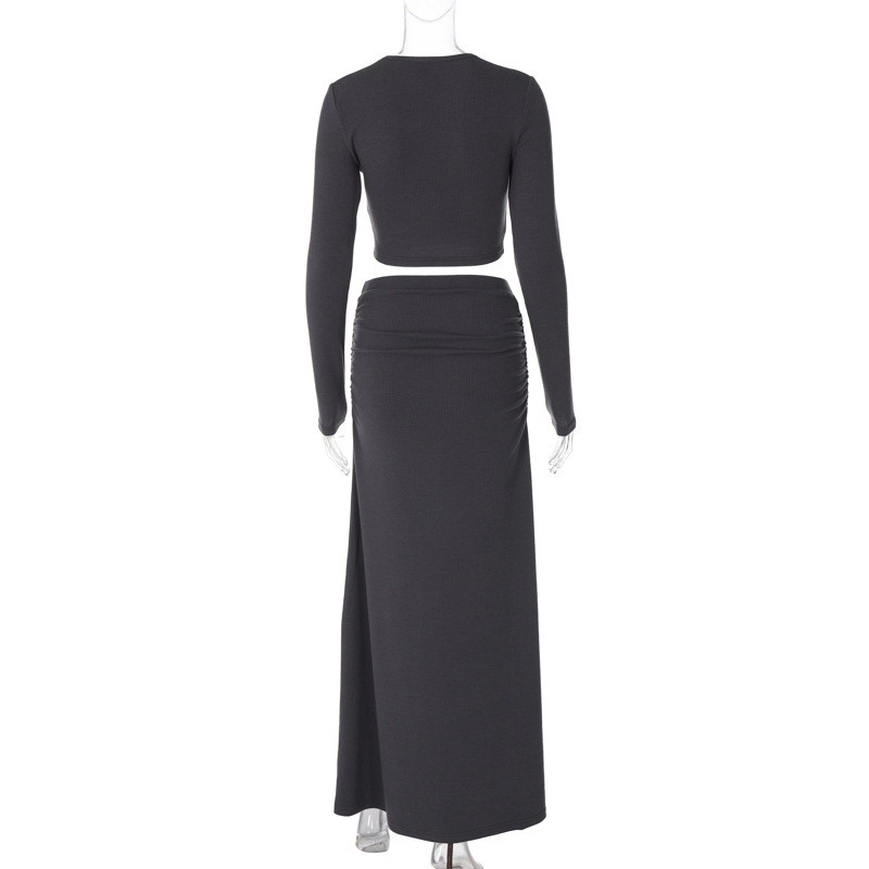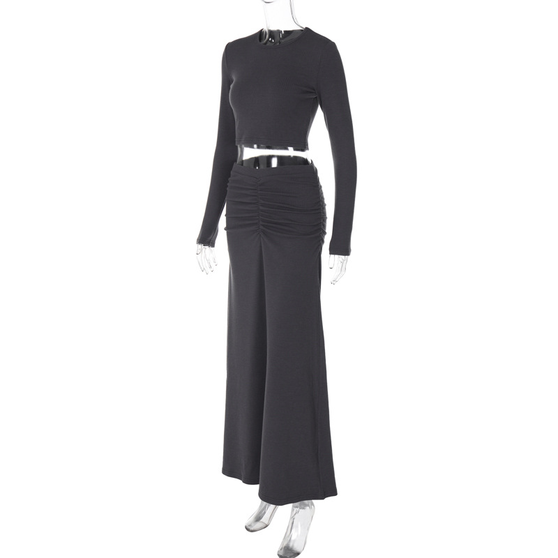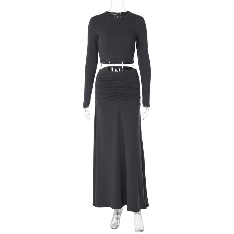 Pleated Skirt Two Piece Winter Women Clothing Solid Color Long Sleeve Casual Set Women
