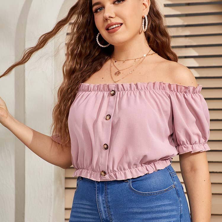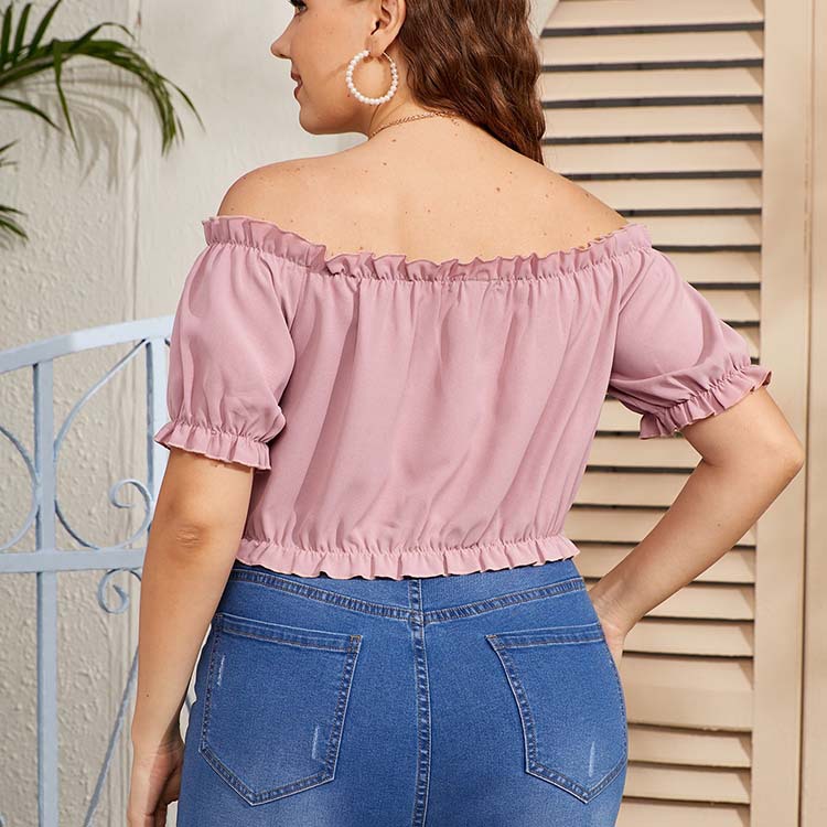 Plus Size Loose Retro Diagonal Solid Color off Neck Office Artistic Top Lace Shirt Short Sleeve