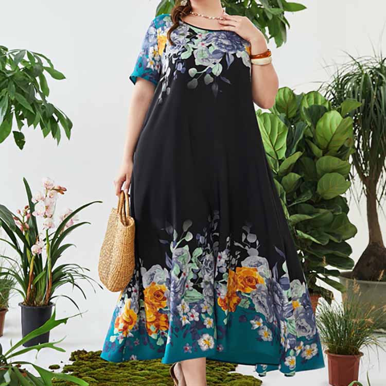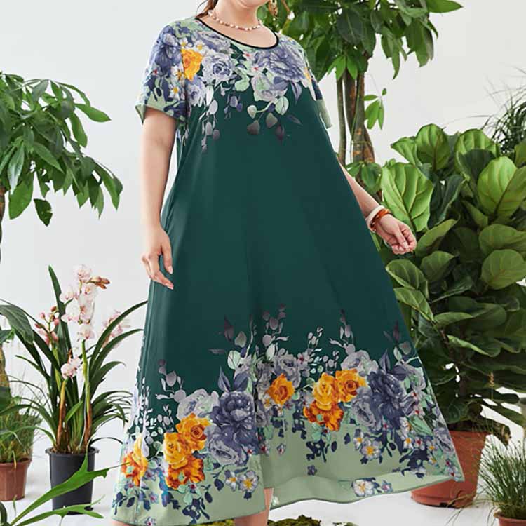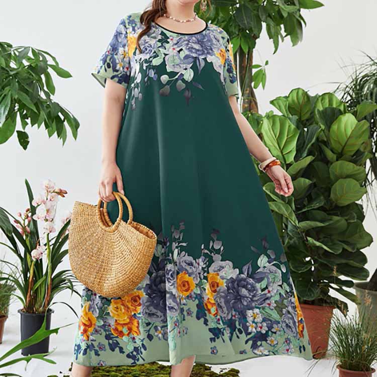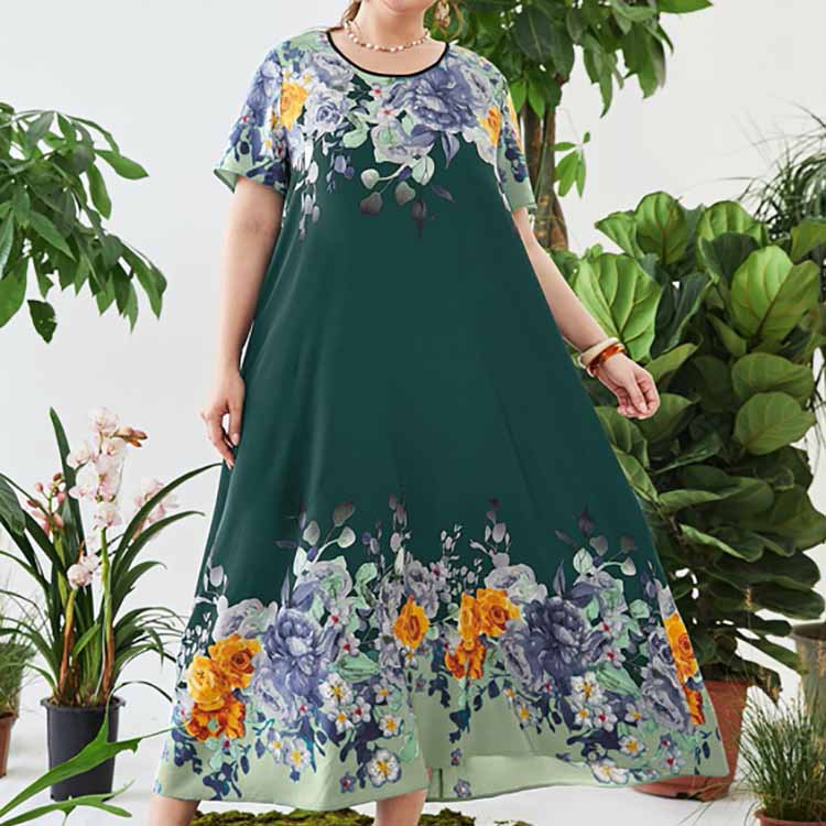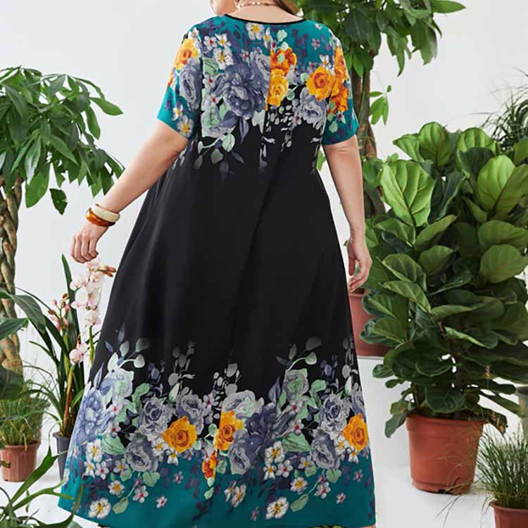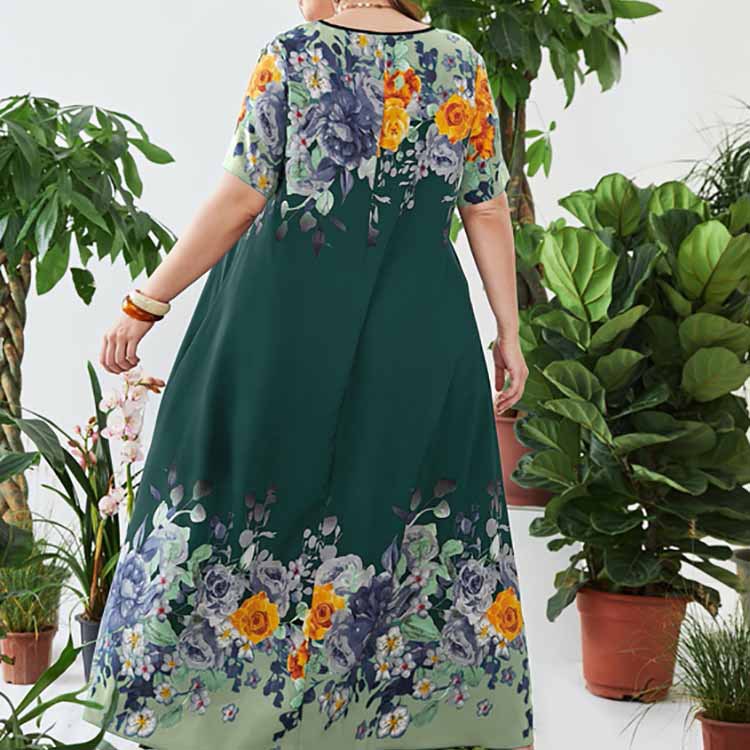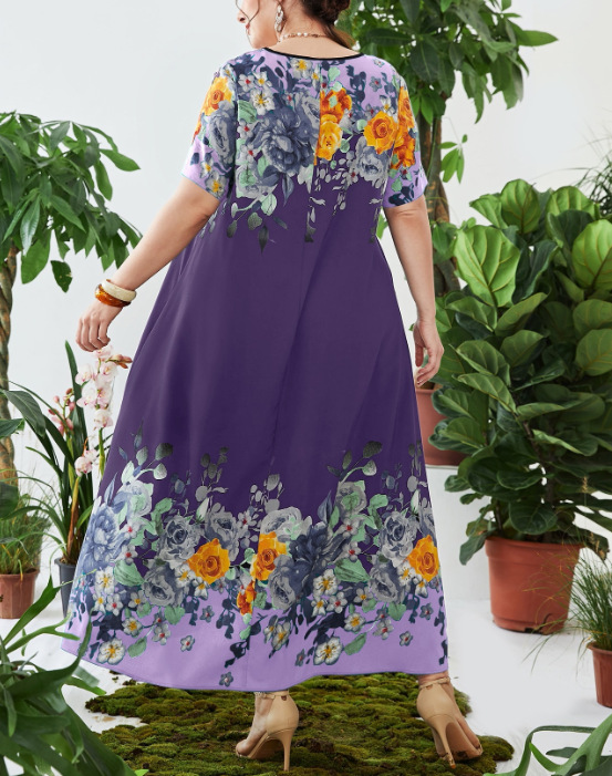 Plus Size Maxi Dress Belly Covering V neck Elastic Waist Printed Dress