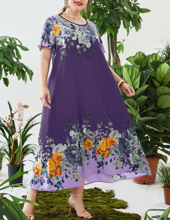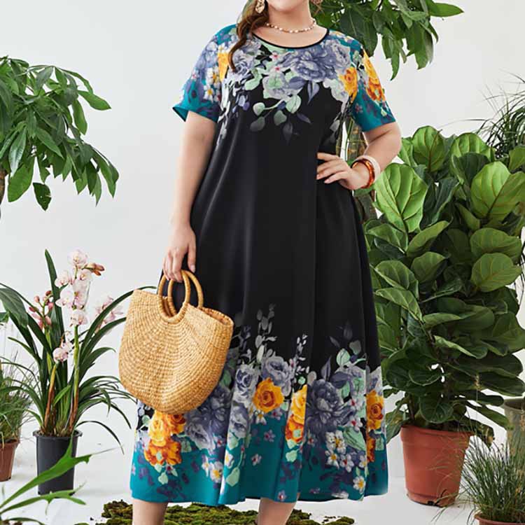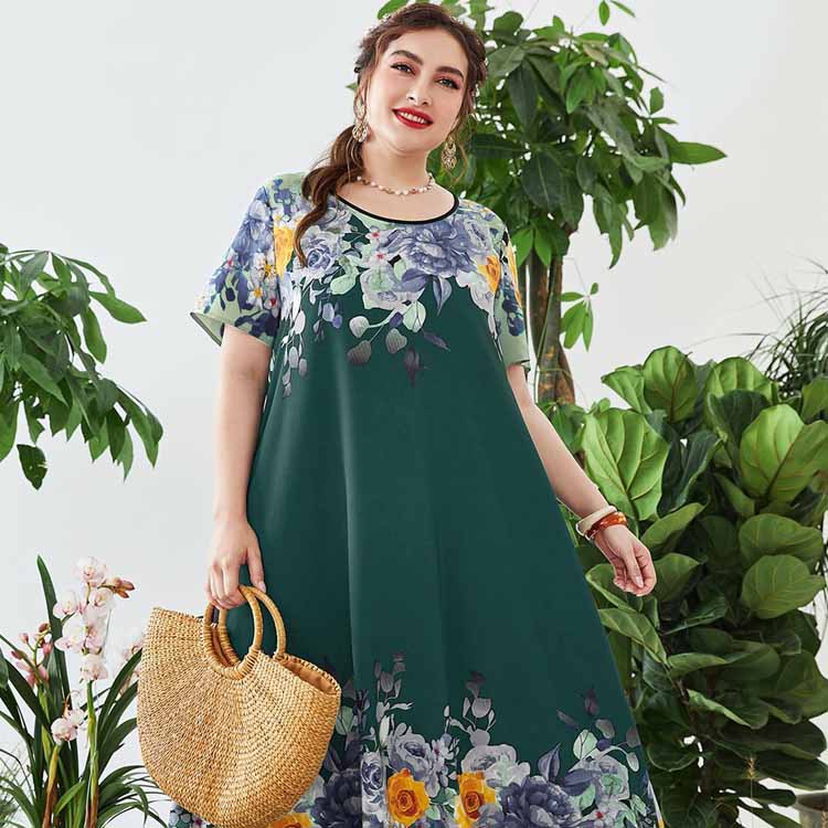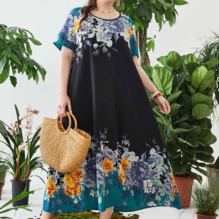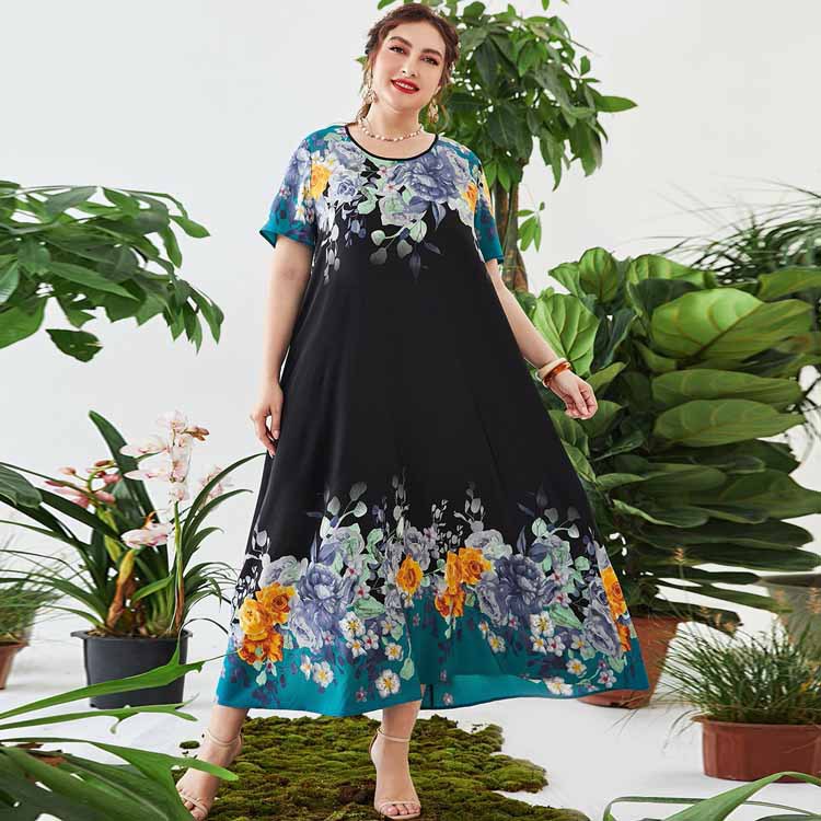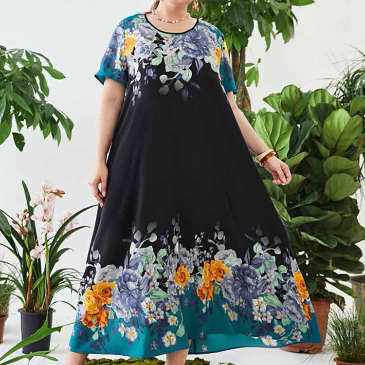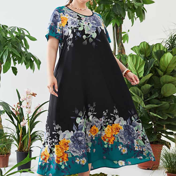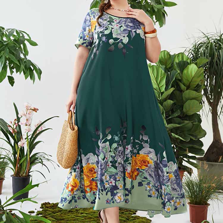 Plus Size Maxi Dress Belly Covering V neck Elastic Waist Printed Dress