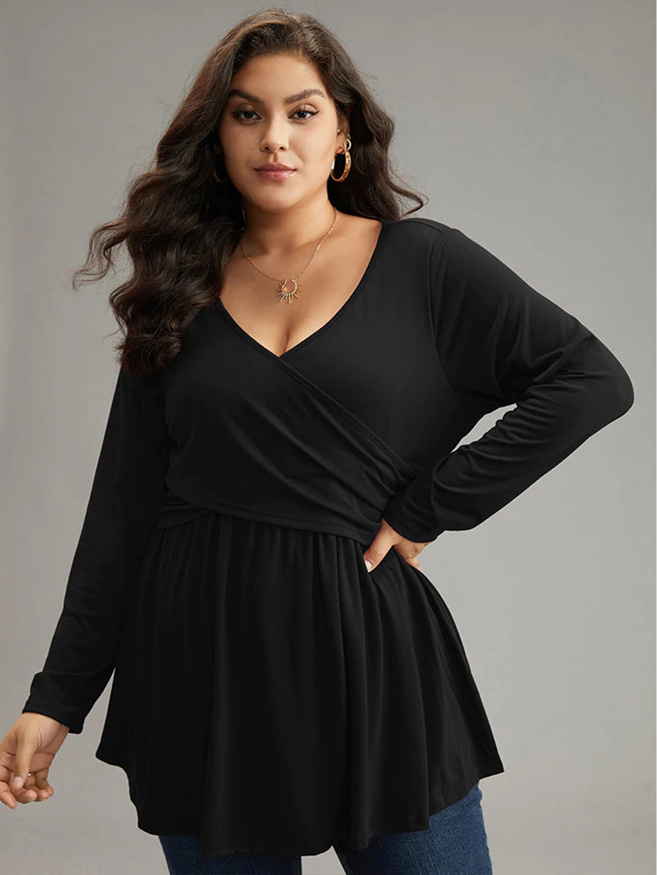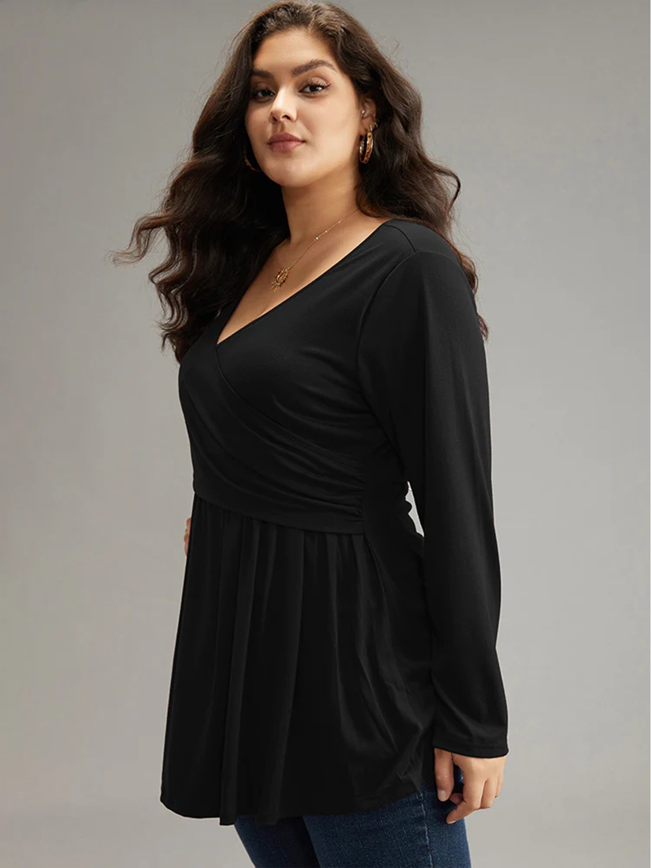 Plus Size Solid Color Pleated Design Bottoming Shirt Autumn Sexy Elegant Loose Long Sleeve T Shirt V Neck Shoulder Top