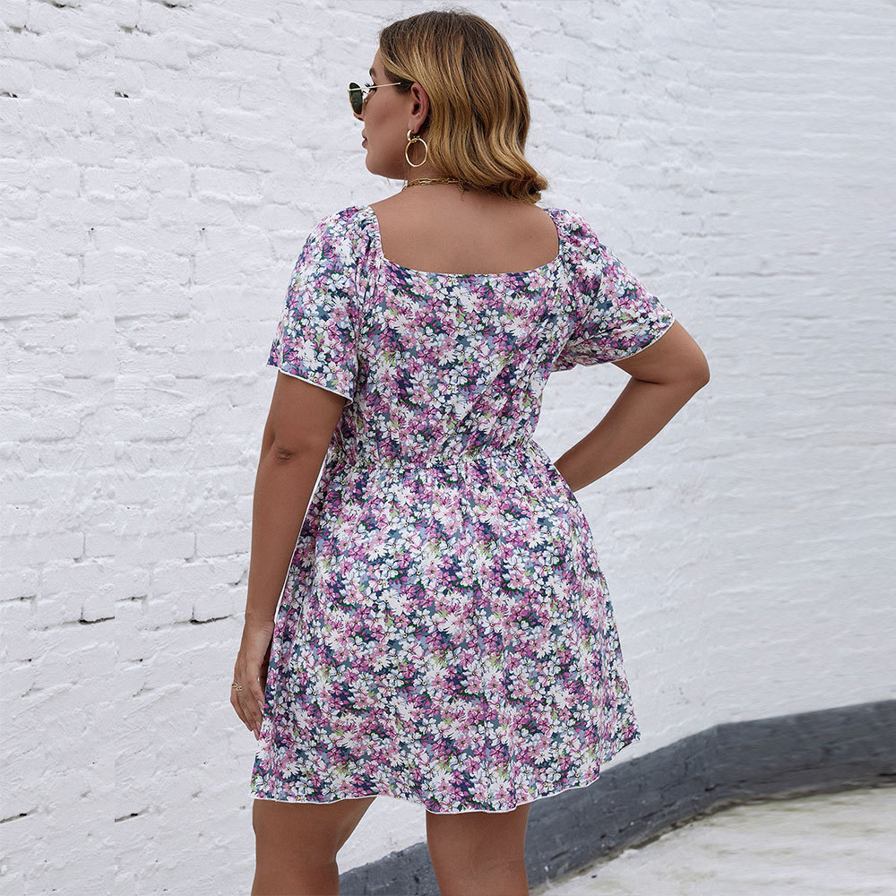 Plus Size Summer Women Clothing Sexy V Neck Waist Controlled Large Hem Short Sleeve Printing Dress