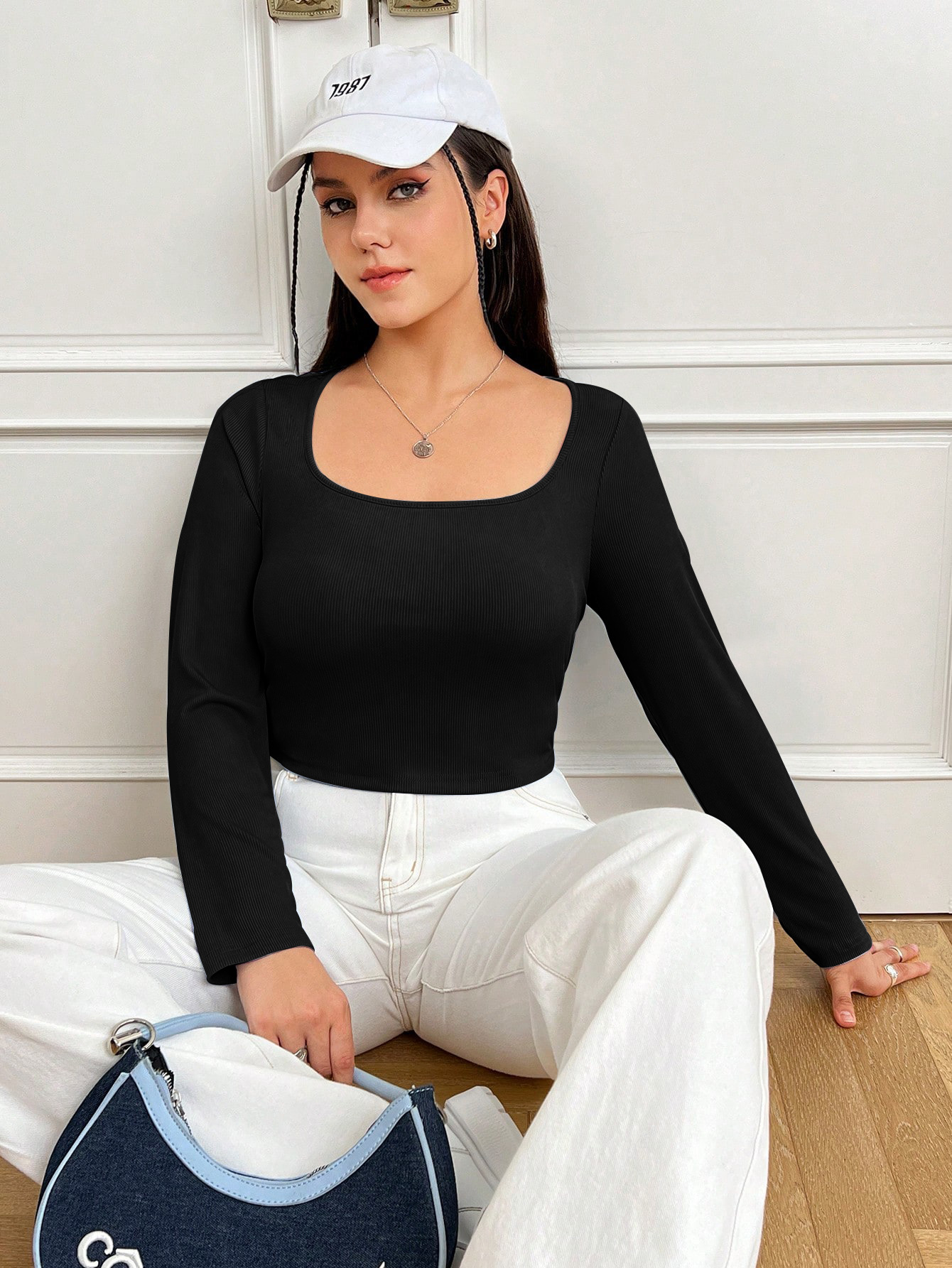 plus Size Women Clothes Office U Neck Long Sleeved T shirt Slim Fit Slimming Inner Solid Color Top