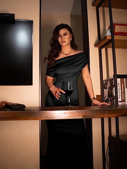 plus Size Women Clothing Hip Wrapped Dress Solid Color off the Neck Dress