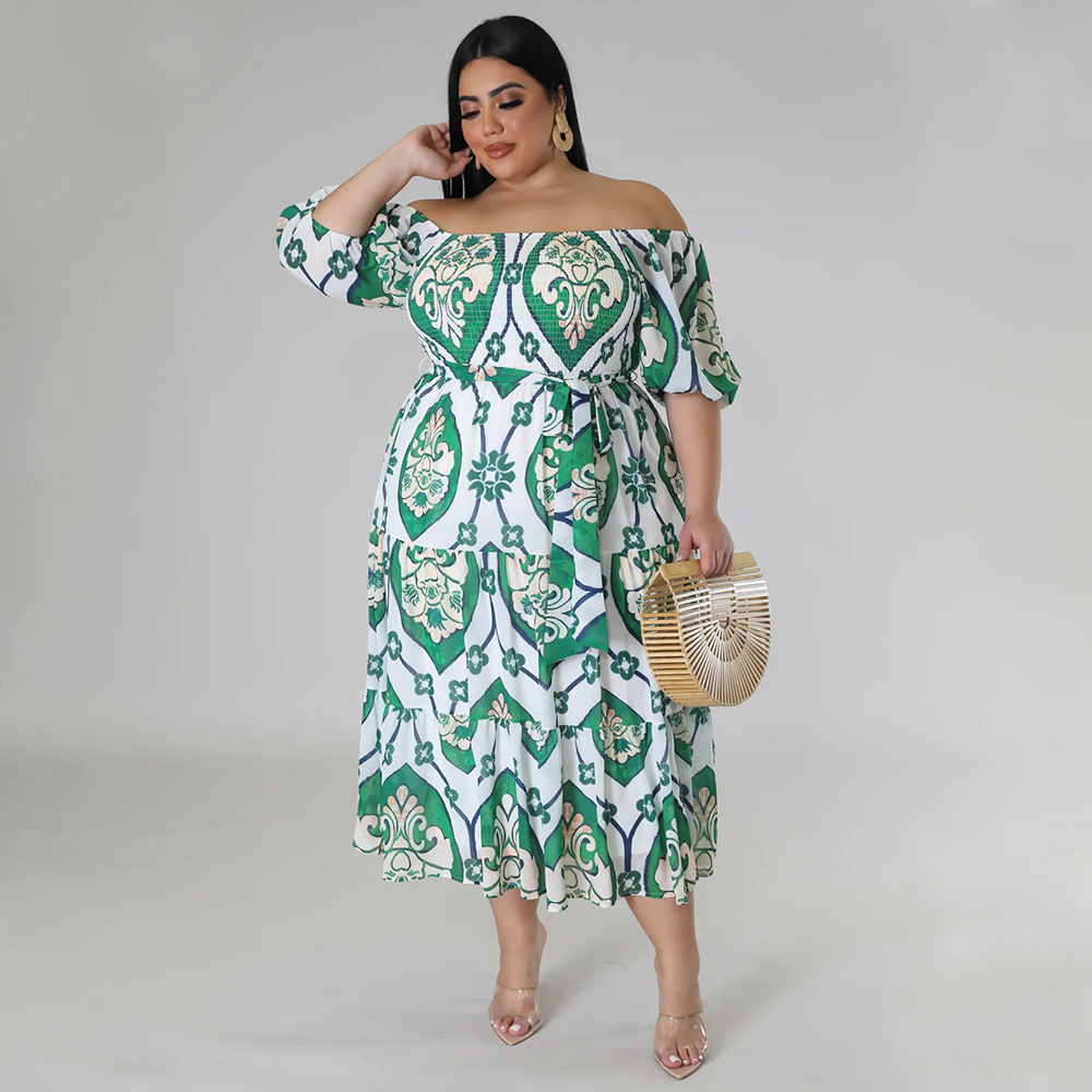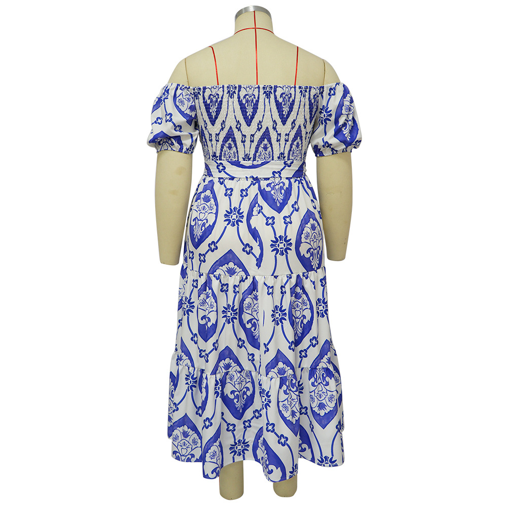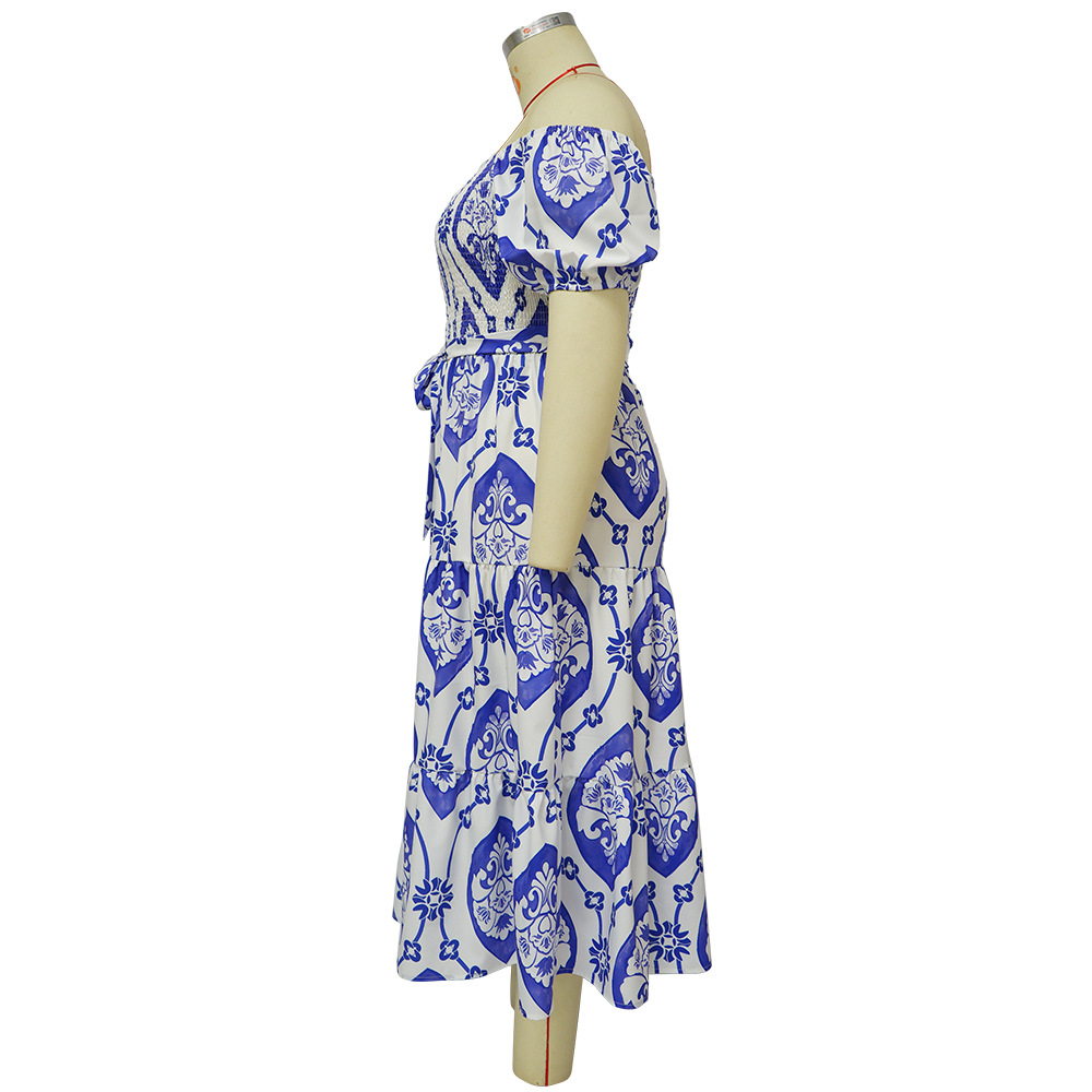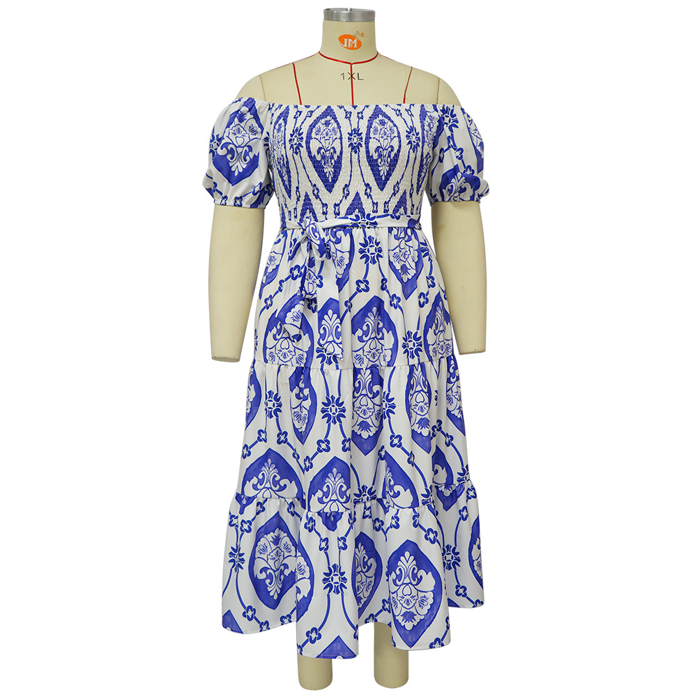 Plus Size Women Clothing Summer Print Short Sleeve Lace Up Folding High Waist Dress