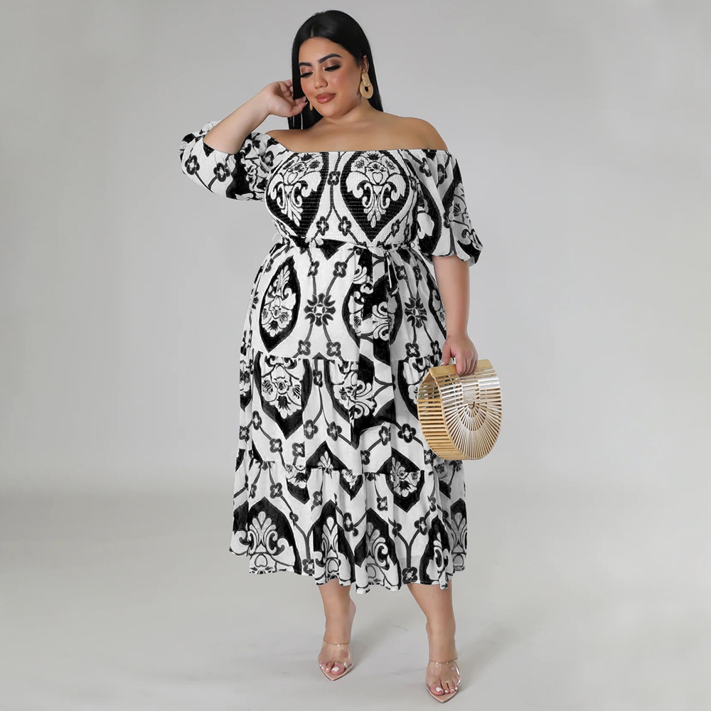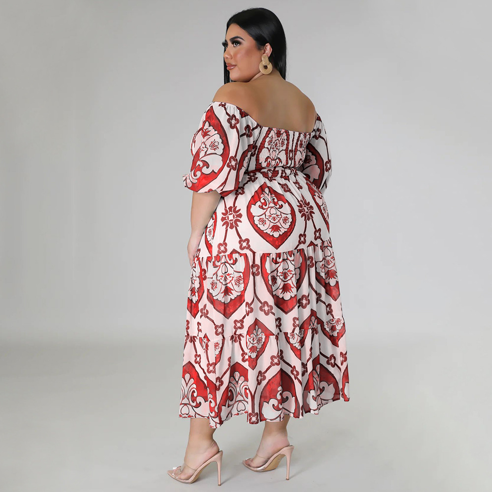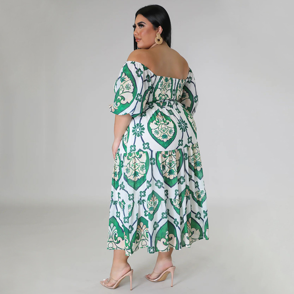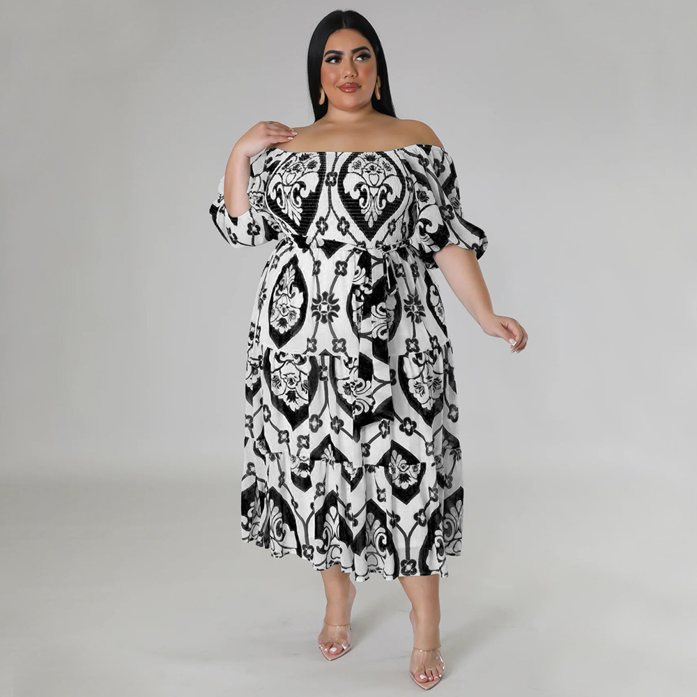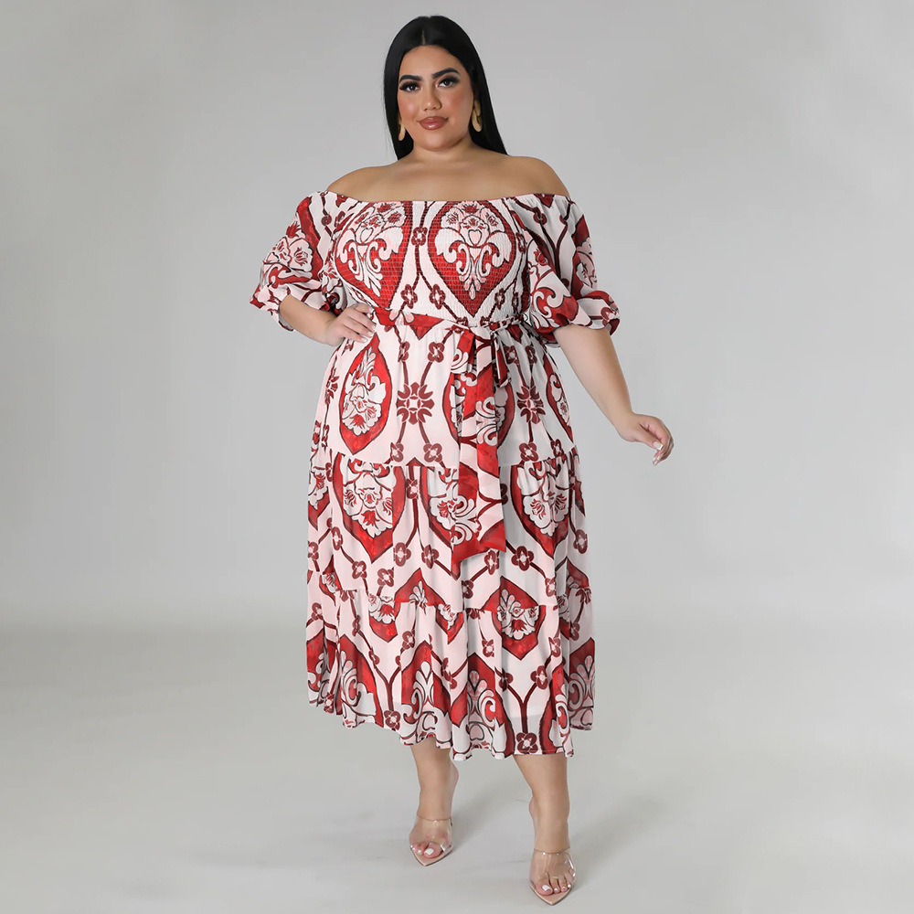 Plus Size Women Clothing Summer Print Short Sleeve Lace Up Folding High Waist Dress
