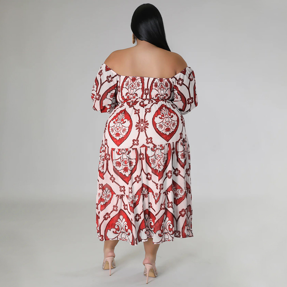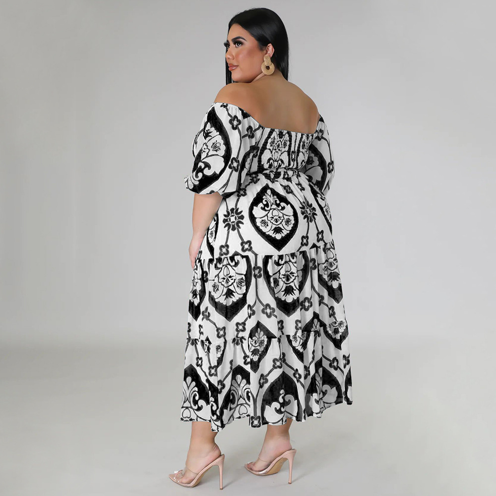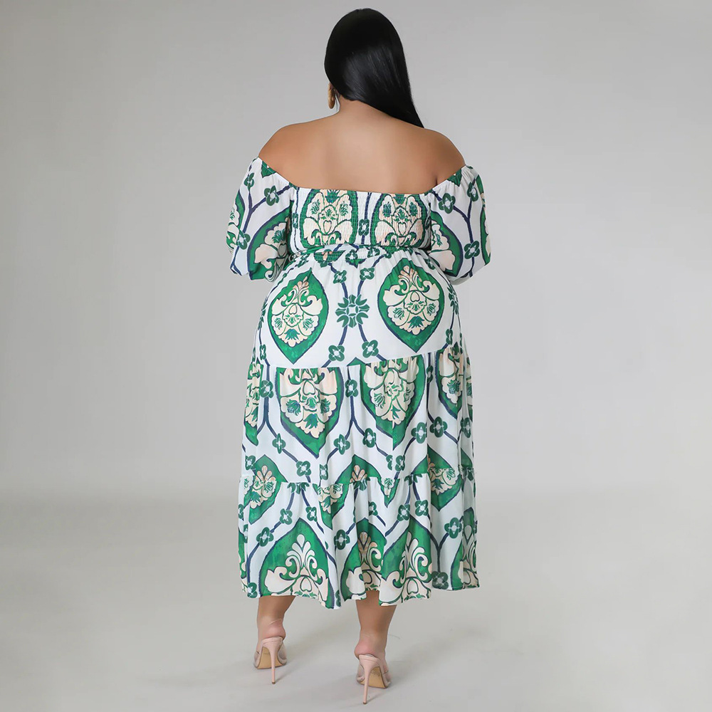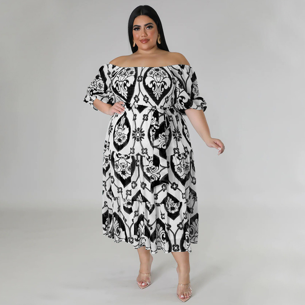 Plus Size Women Clothing Summer Print Short Sleeve Lace Up Folding High Waist Dress