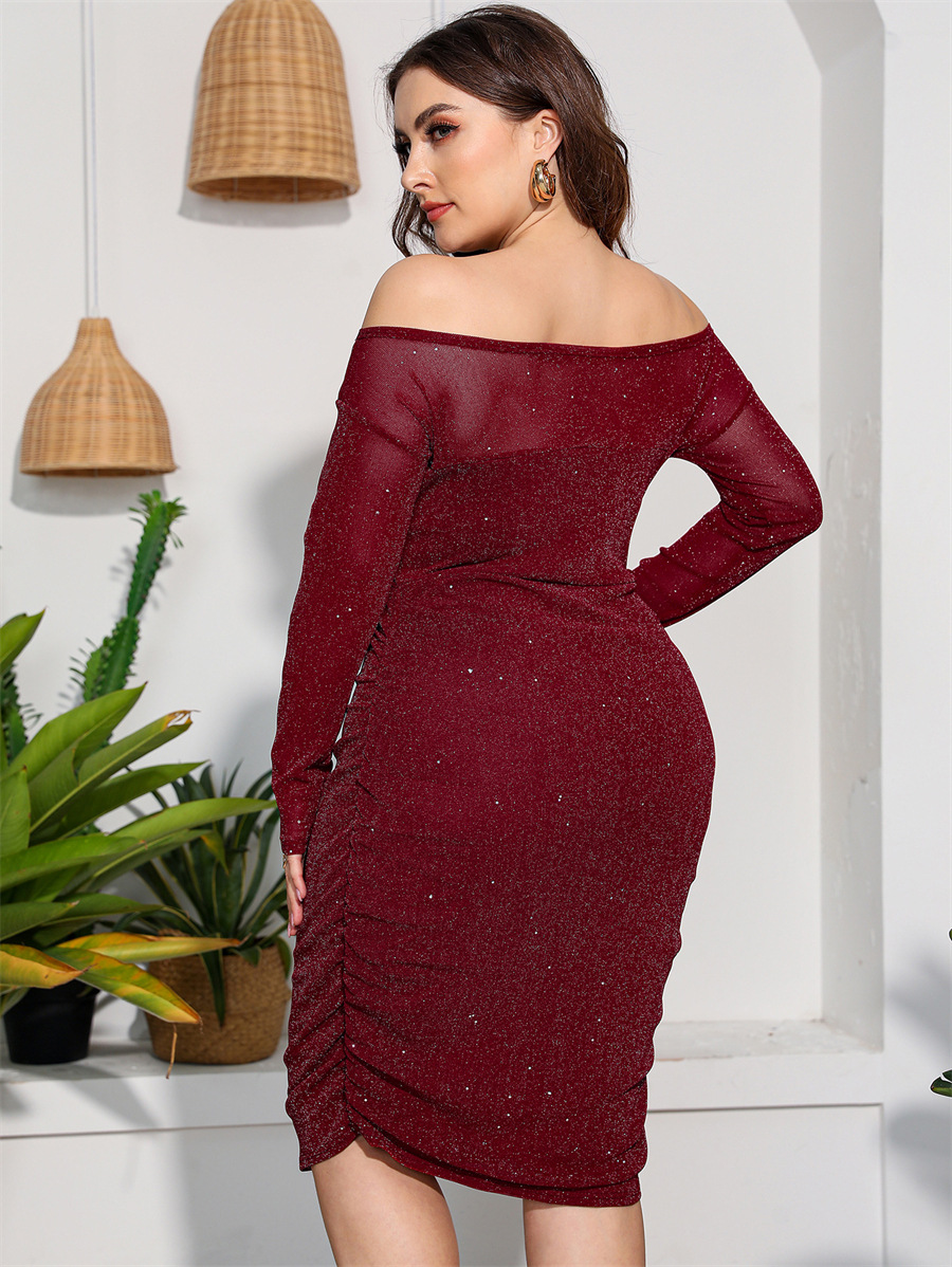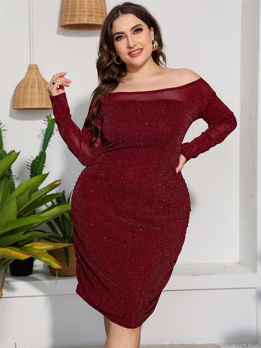 Plus Size Women Dress off-Shoulder Long Sleeve Slim Package Hip Pleated Hollow Out Cutout out Diamond in the Debris Sexy