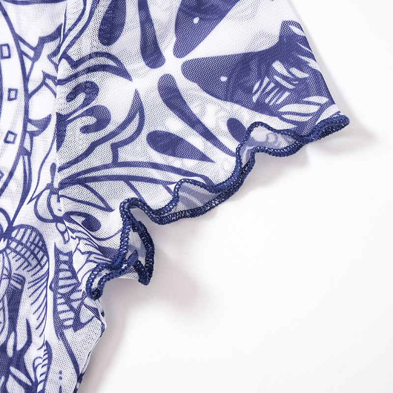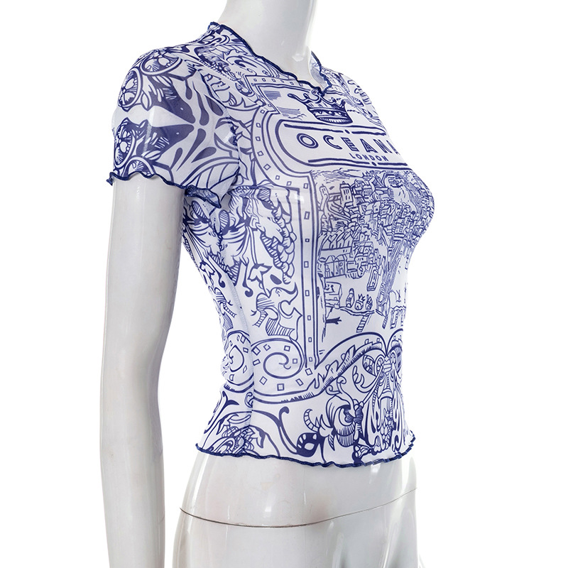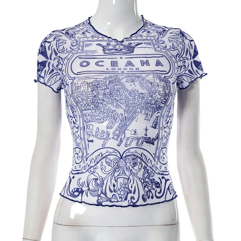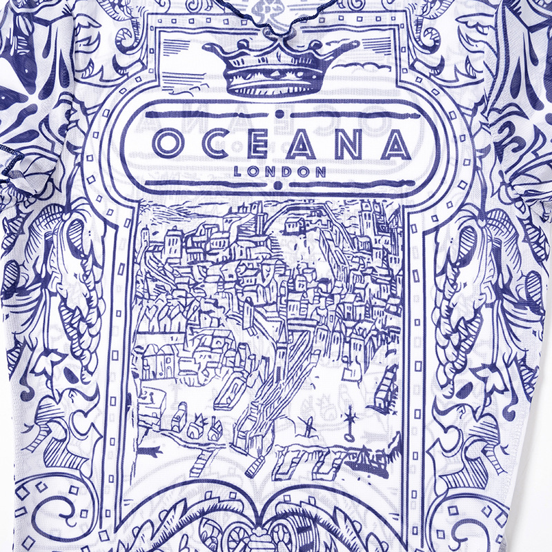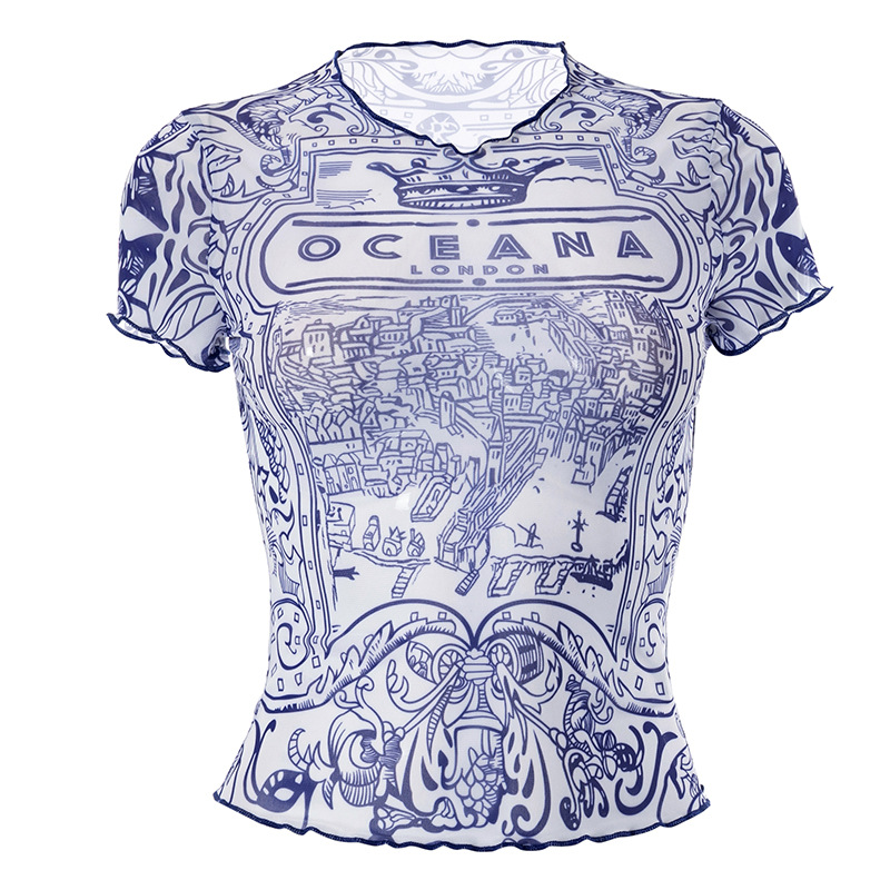 Retro Pattern Printed Mesh Top Women Sexy Sexy Wear Match Summer