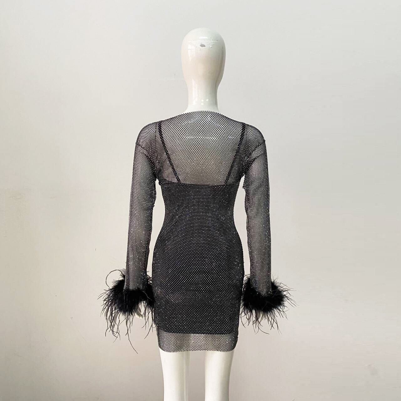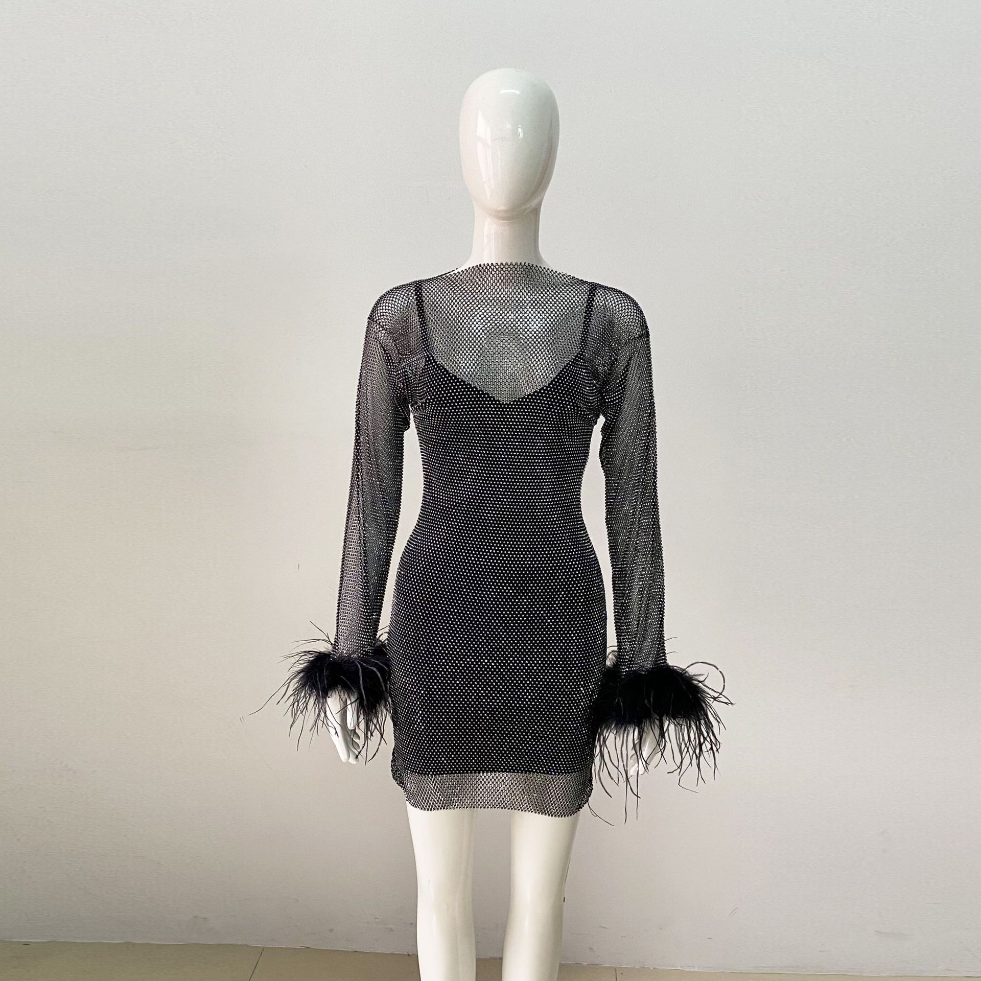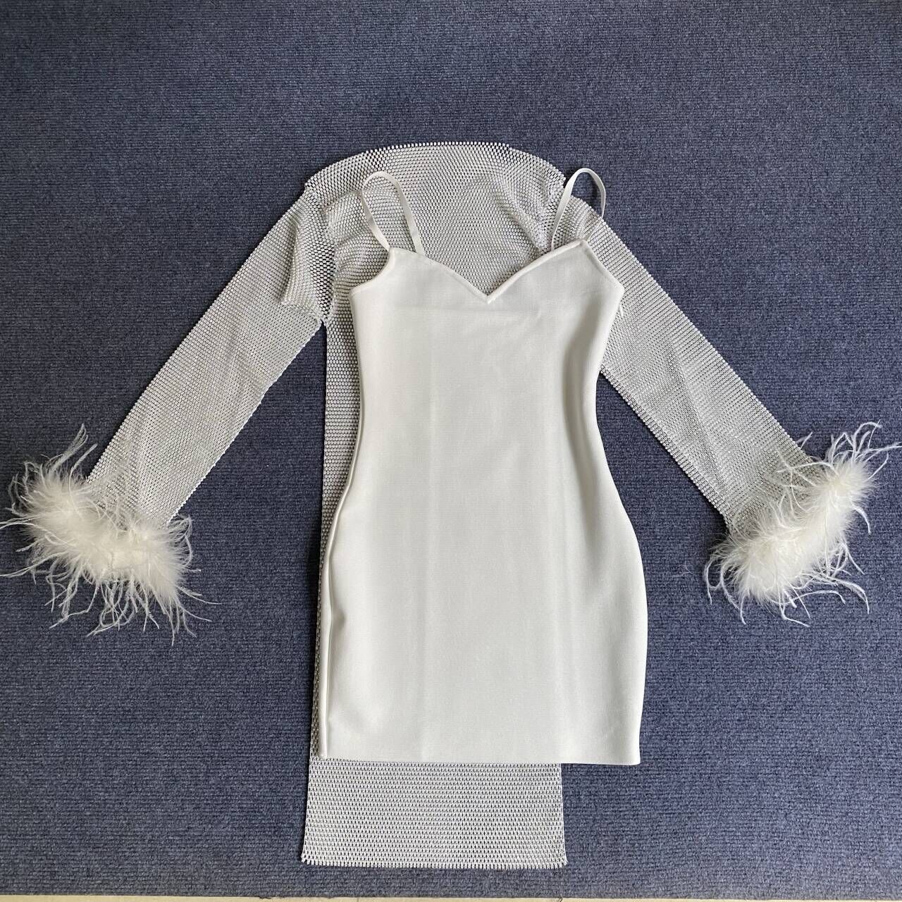 Sexy Long Sleeve Net Drill Feather Sling Bandage Dress Ladies Party Cocktail Dress Dress