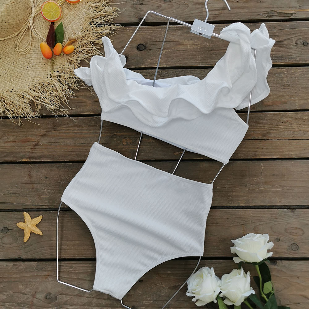 Solid Color Rib Fabric Split Swimsuit Women Swimwear High Waist Ruffles Sexy Bikini