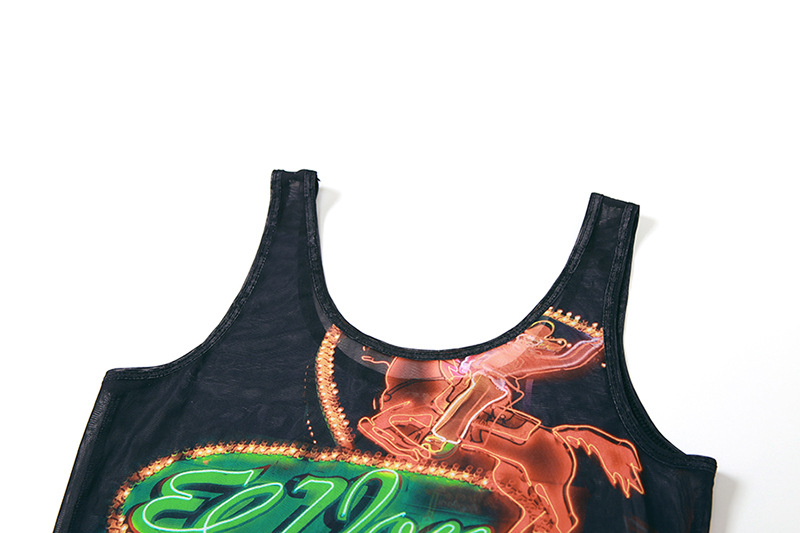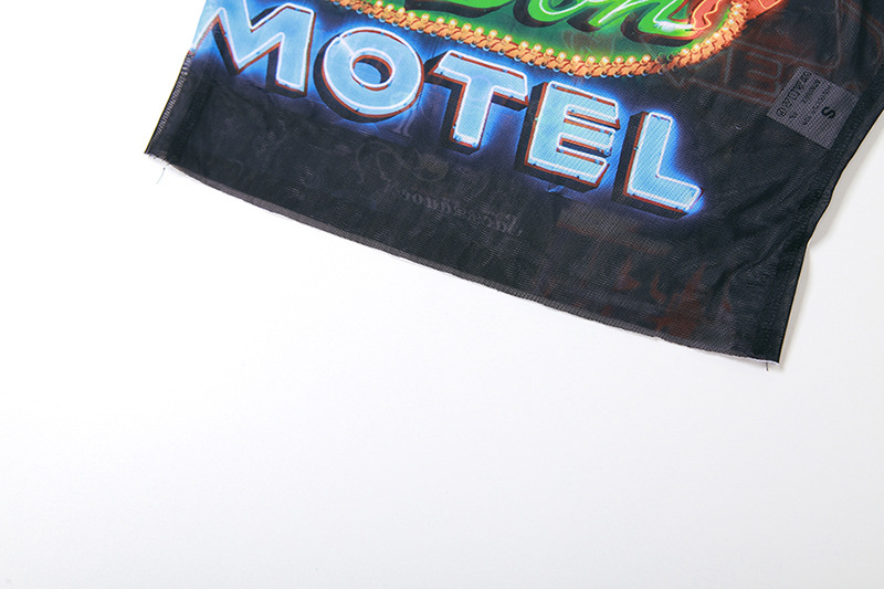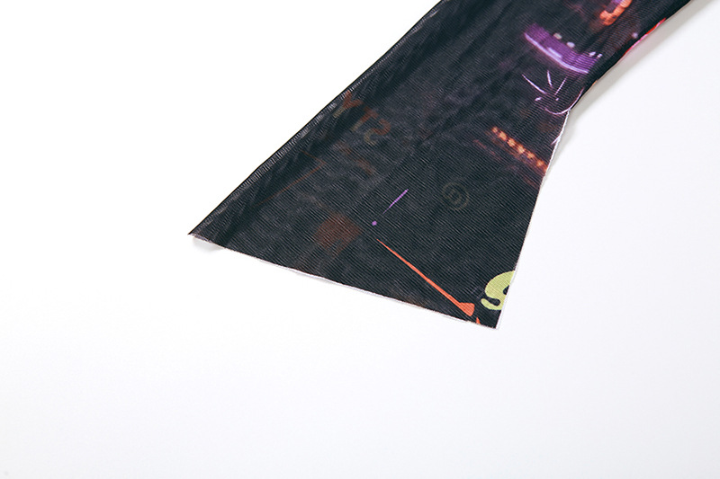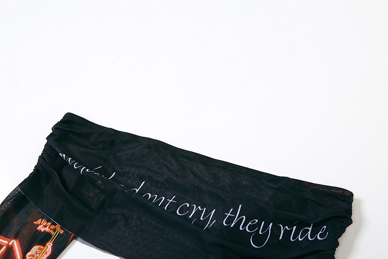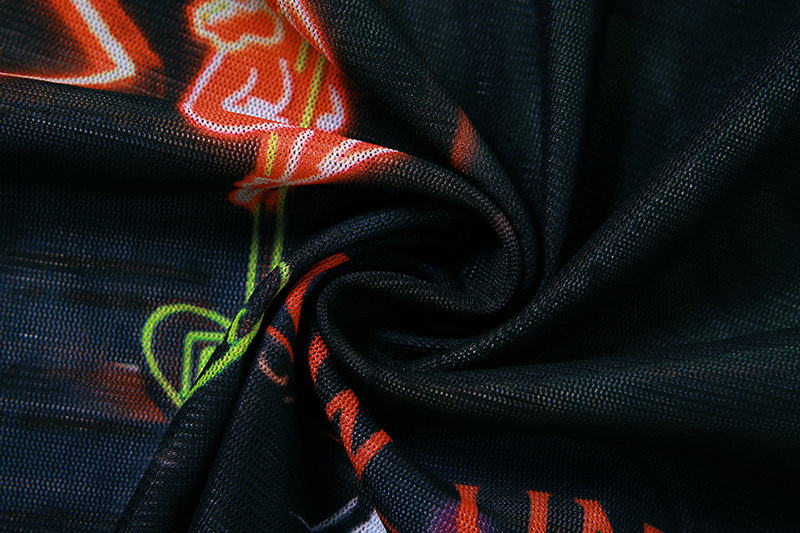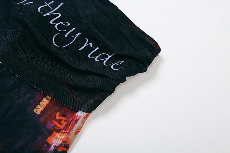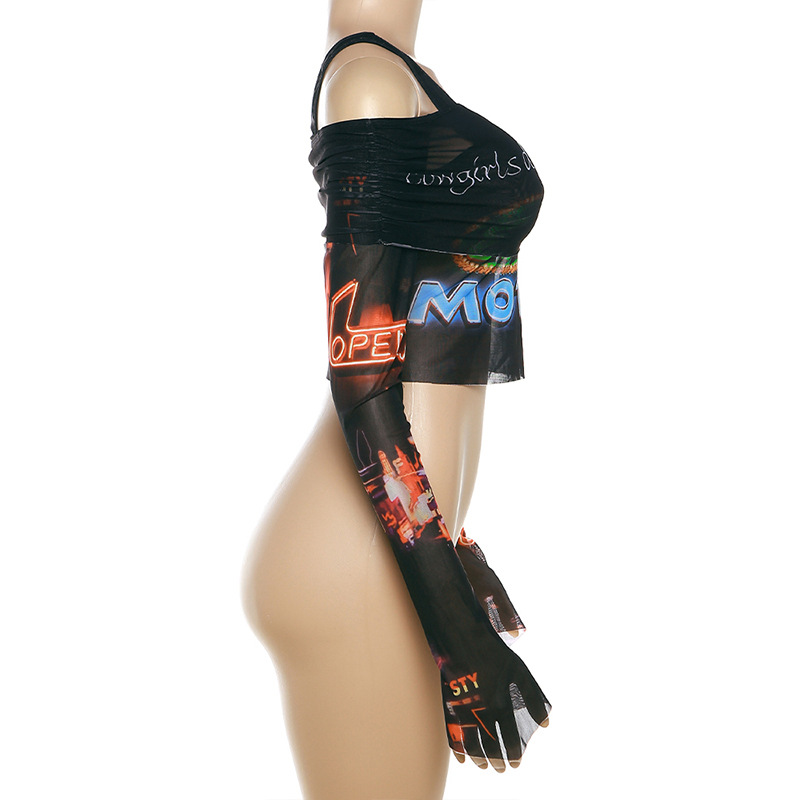 Summer Women Clothing Stitching Printing off the Shoulder Long Sleeve Mesh Slim Fit Street Hipster Top