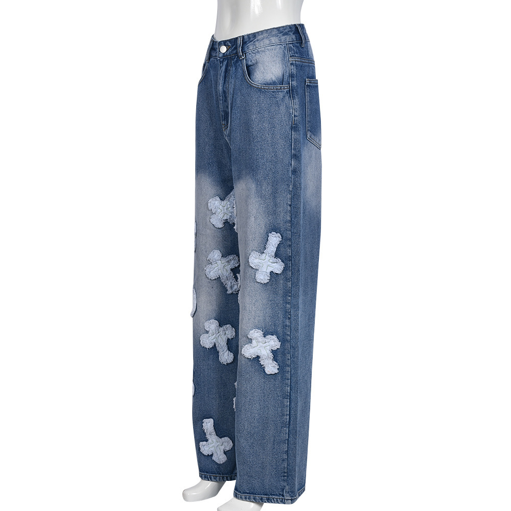 Vintage Washed Denim Tassel Cross Hip Hop Straight Leg Trousers