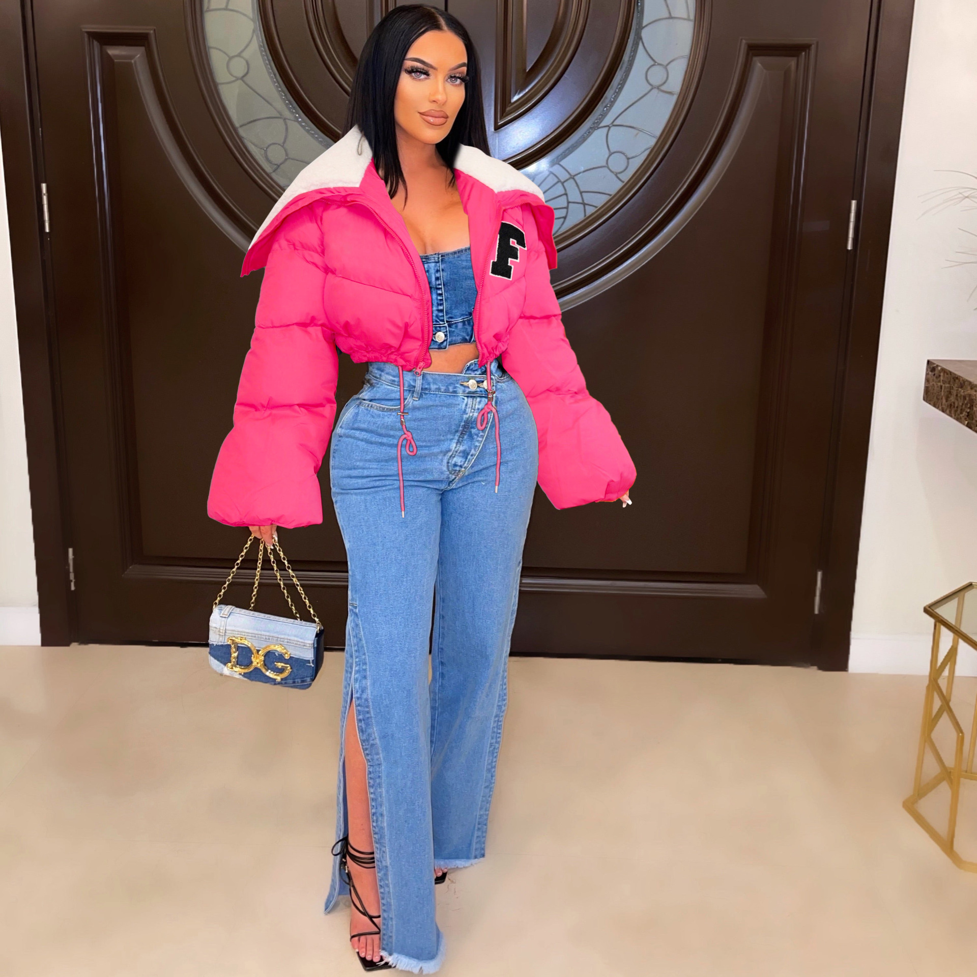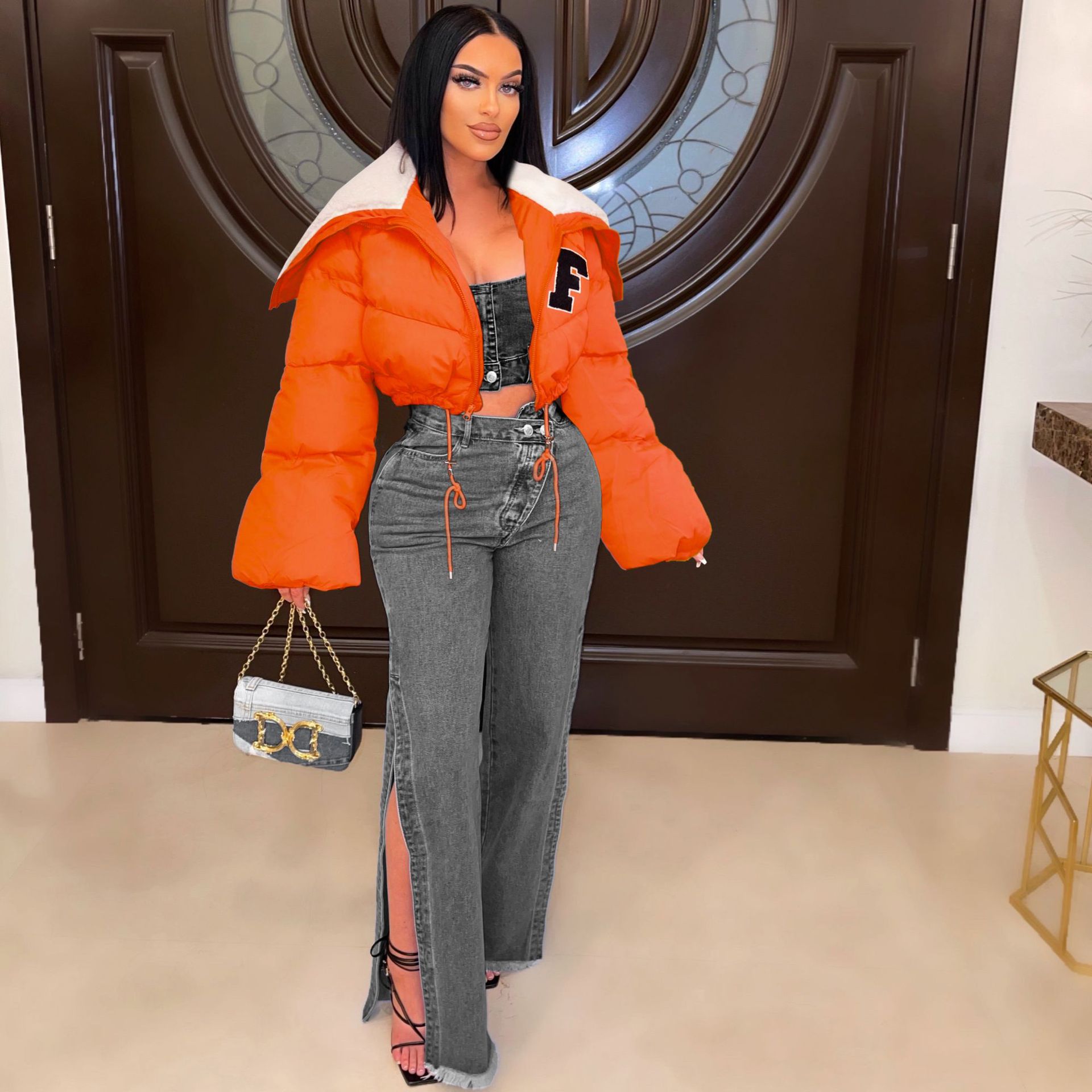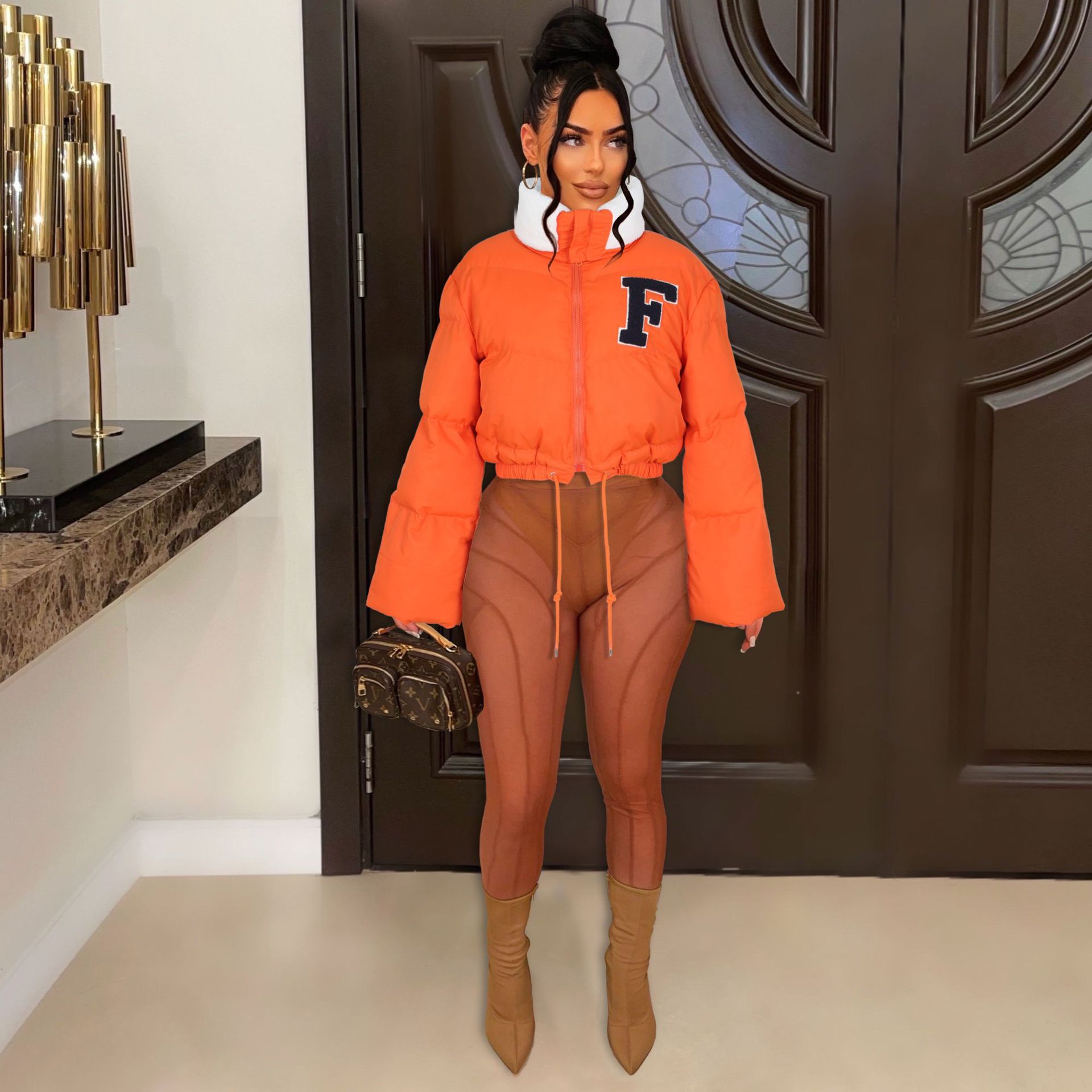Women Clothing Autumn Winter Letter Graphic Embroidery North Cotton Padded Casual Polar Fleece Large Collared Jacket Coat