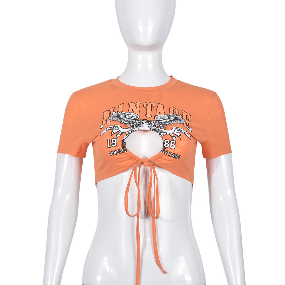 Women Clothing Pullover Hollow Out Cutout Adhesive Cement Letters Short Sleeve Lace up Top Women Clothing