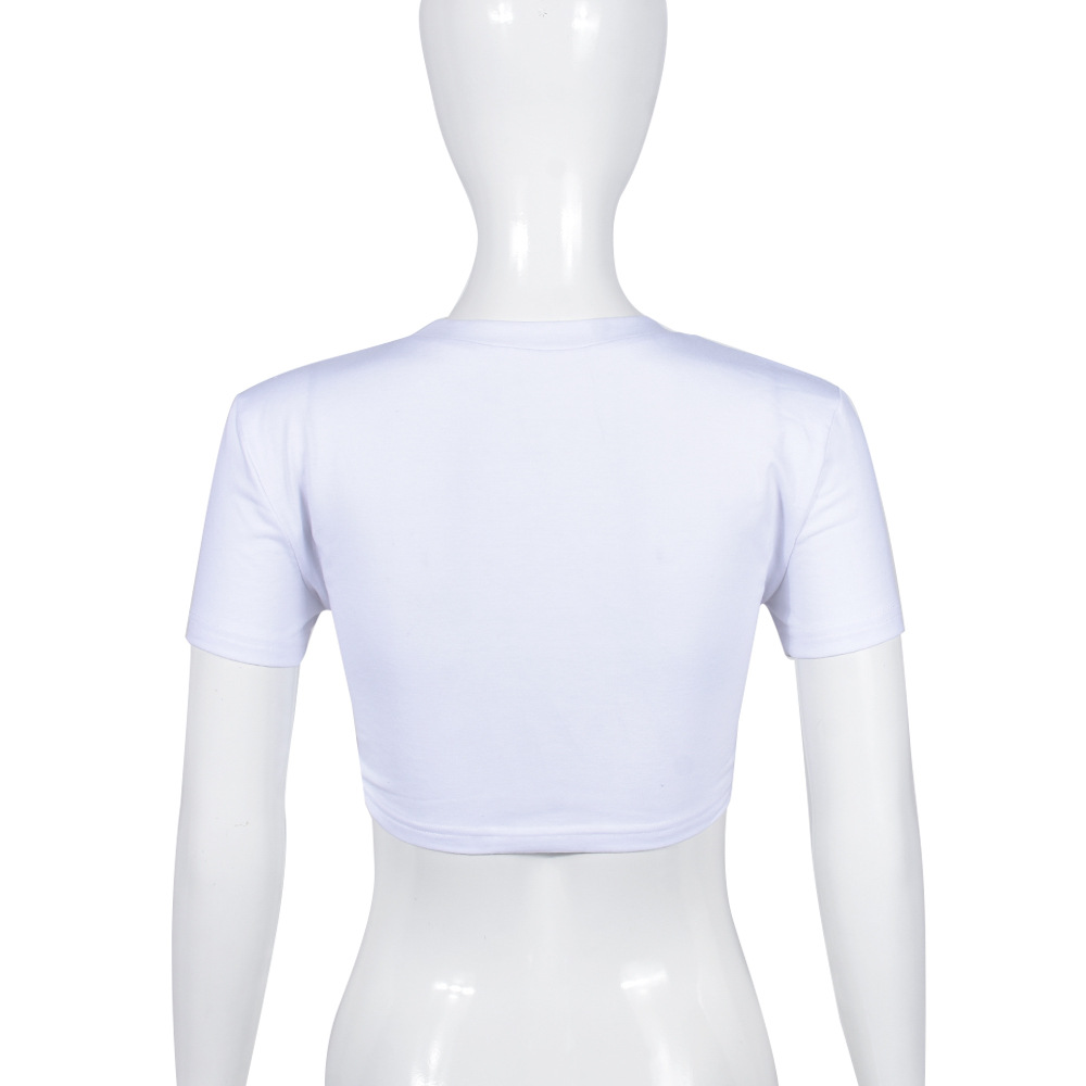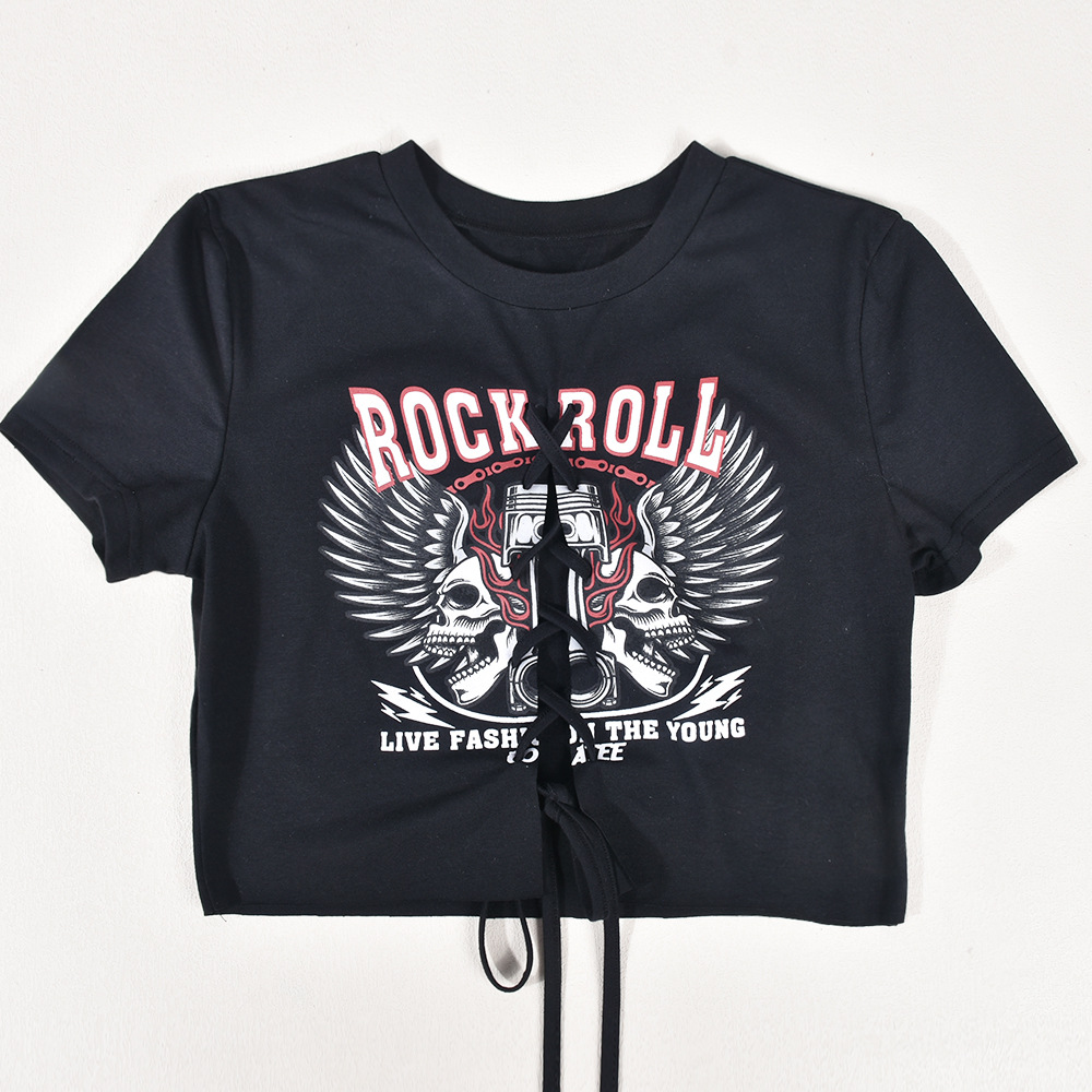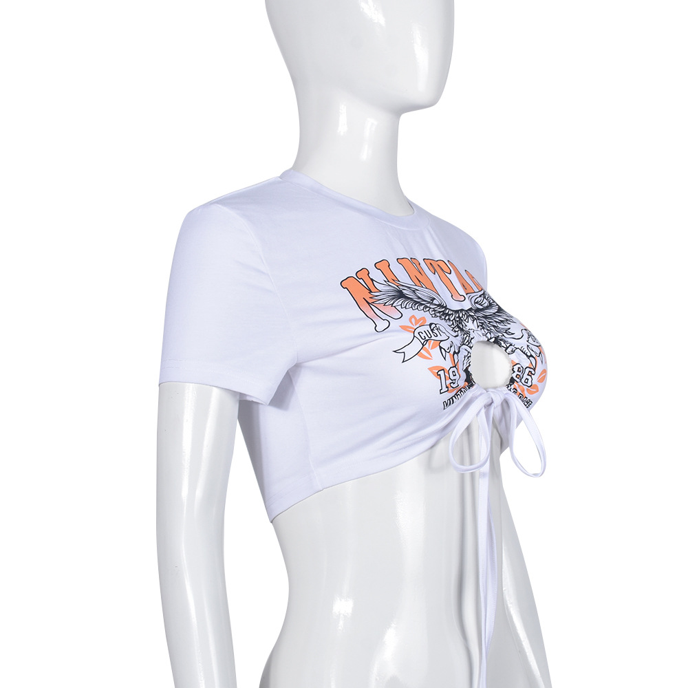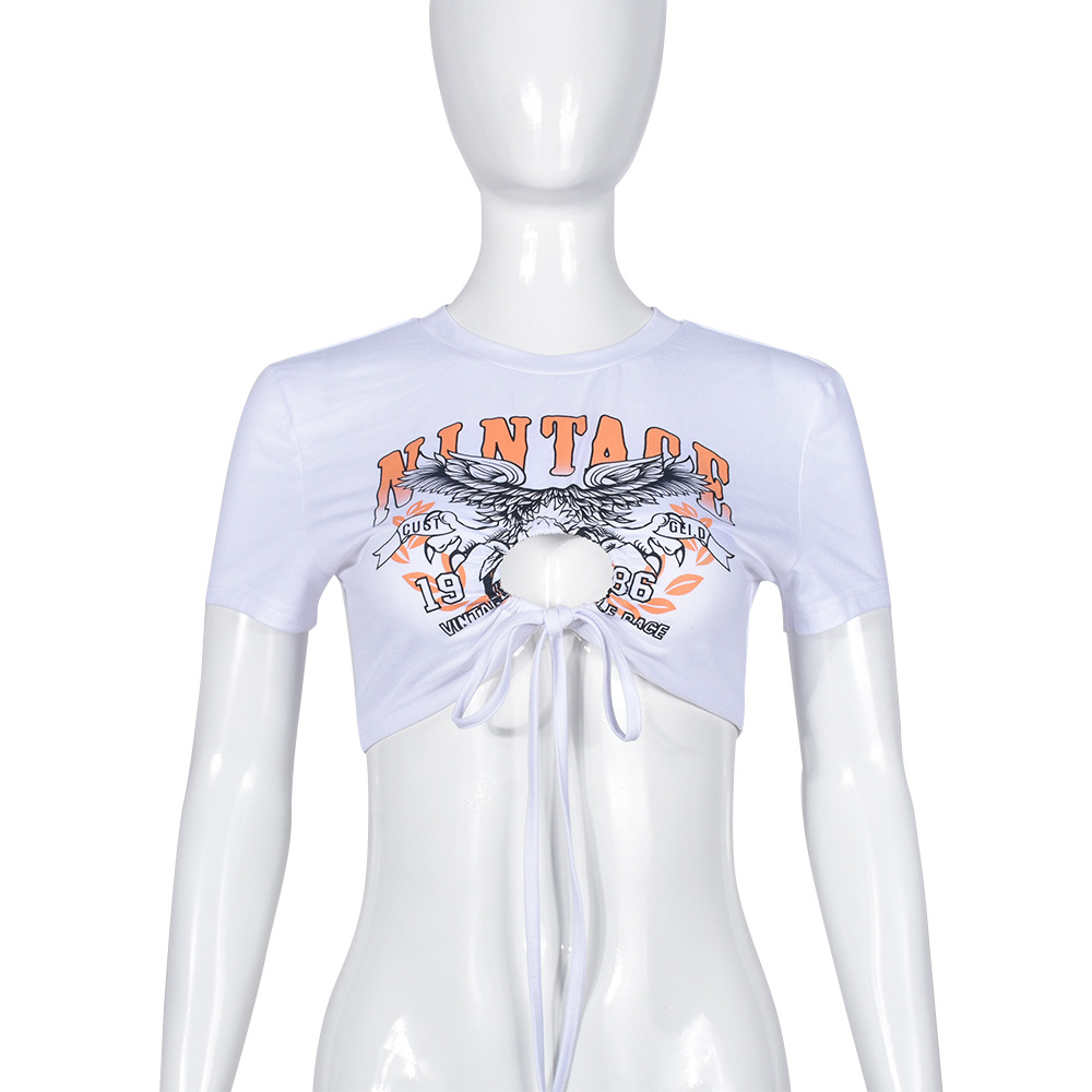 Women Clothing Pullover Hollow Out Cutout out Adhesive Cement Letters Short Sleeve Lace up Top Women Clothing