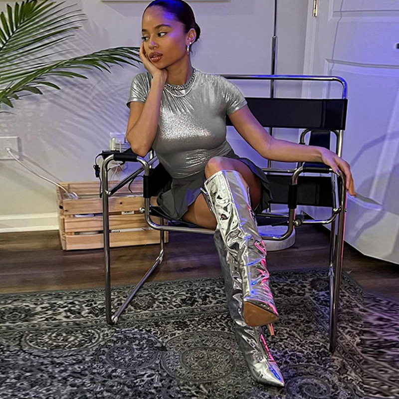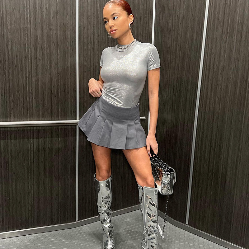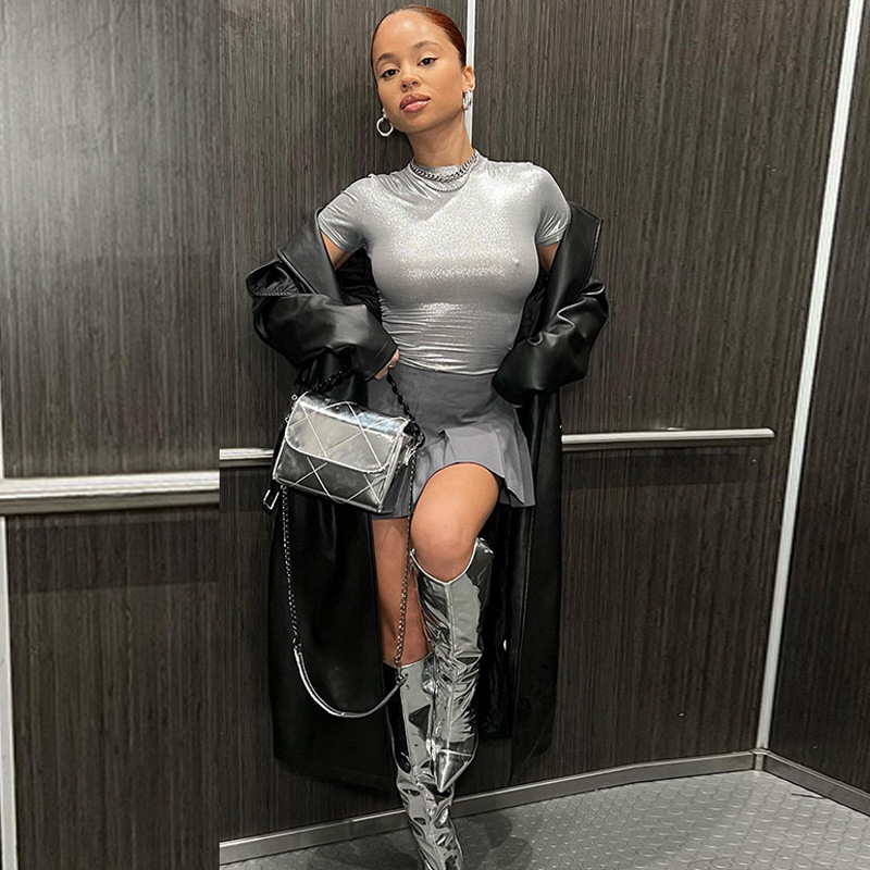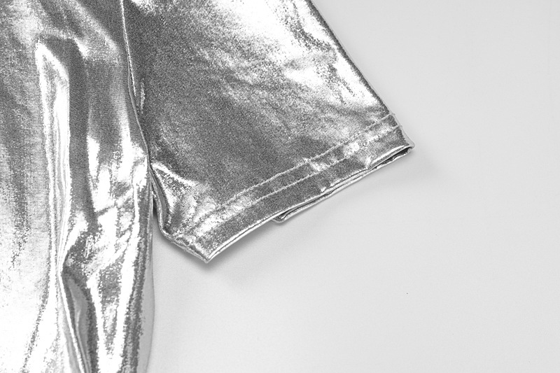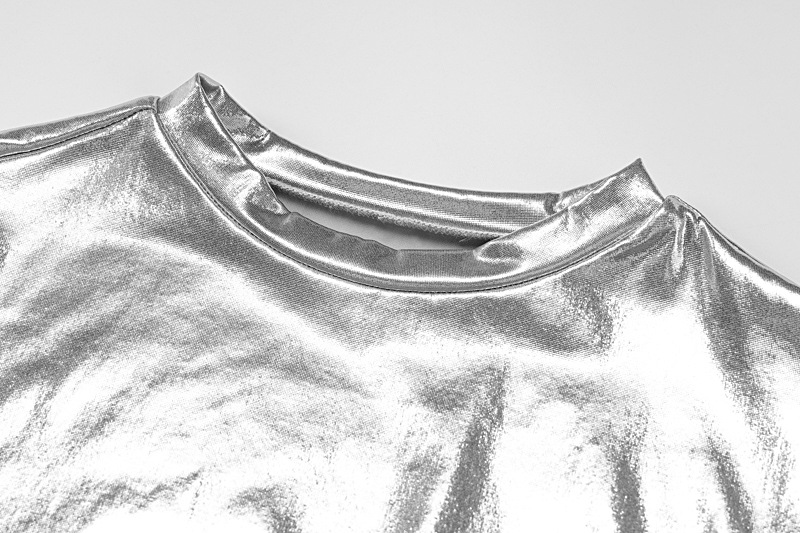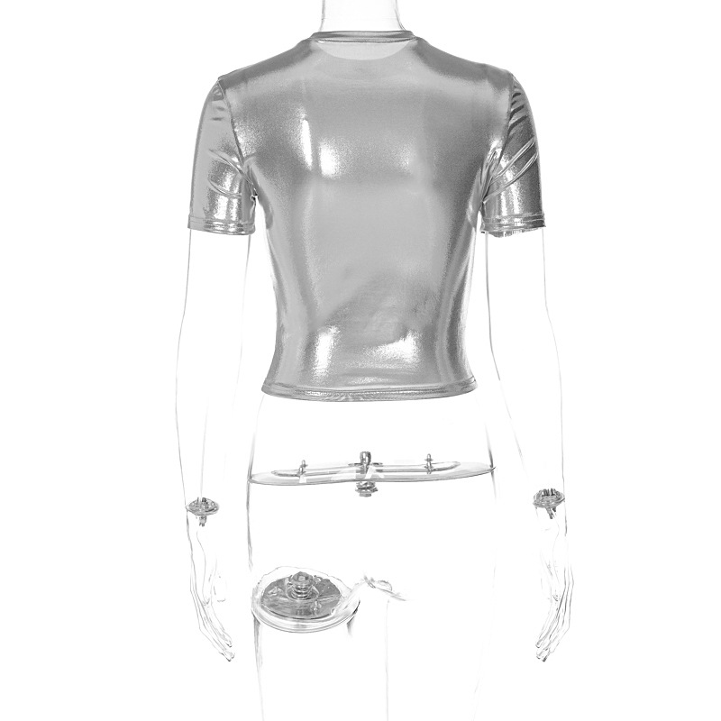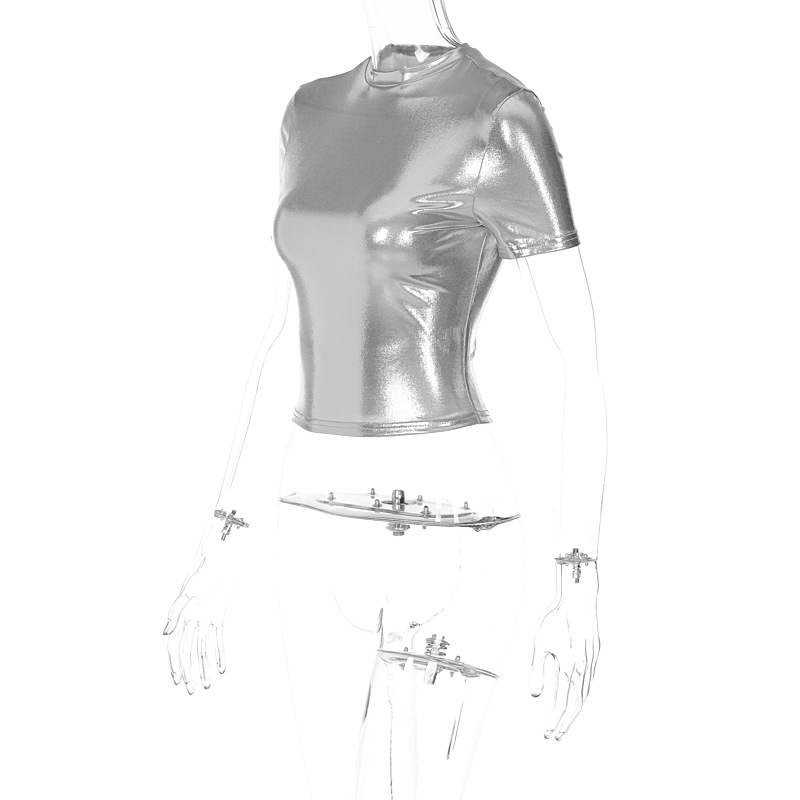 Women Clothing Spring Metallic Round Neck Short Sleeve Tight T shirt Top