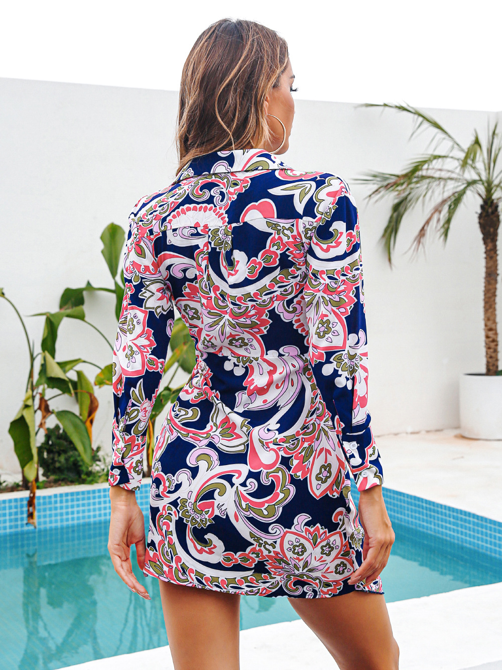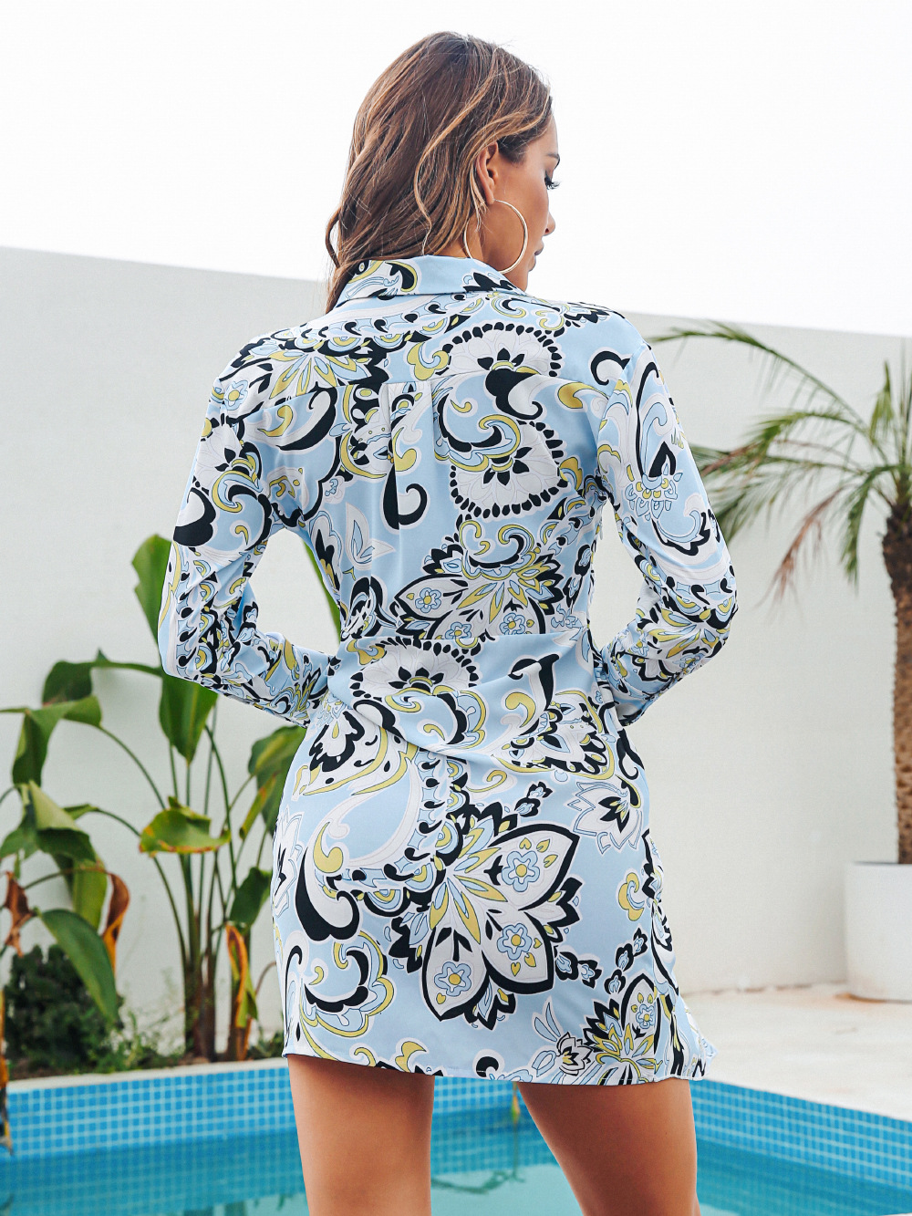 Women Clothing Spring Summer New Vintage Print Lace-up Waist Dress Shirt Dress