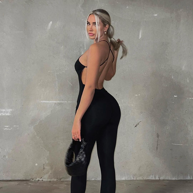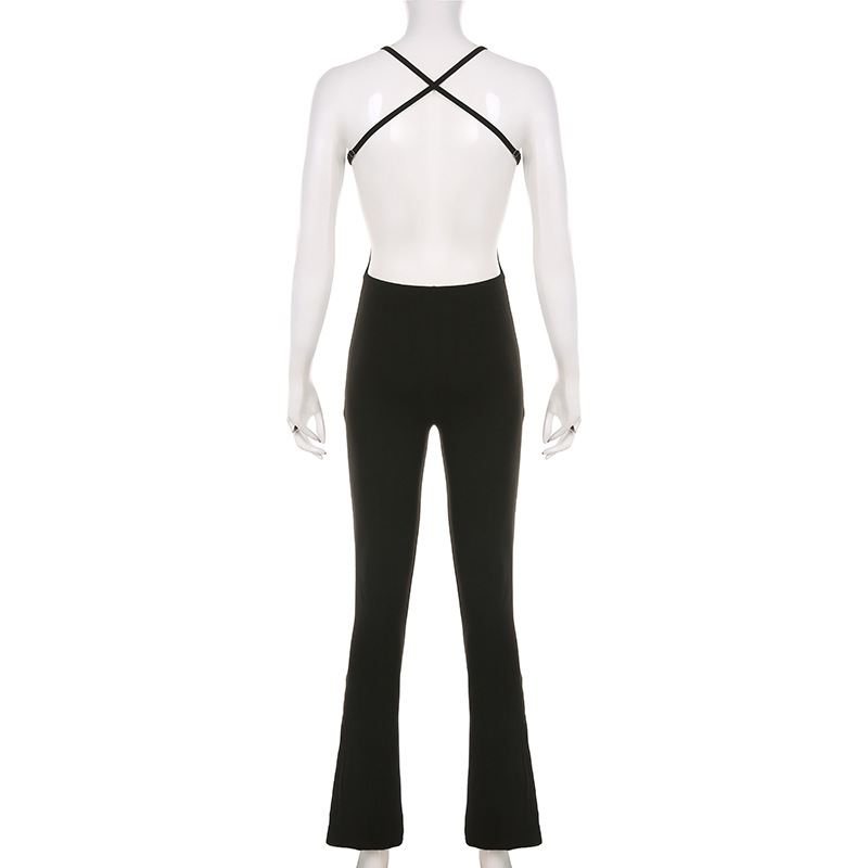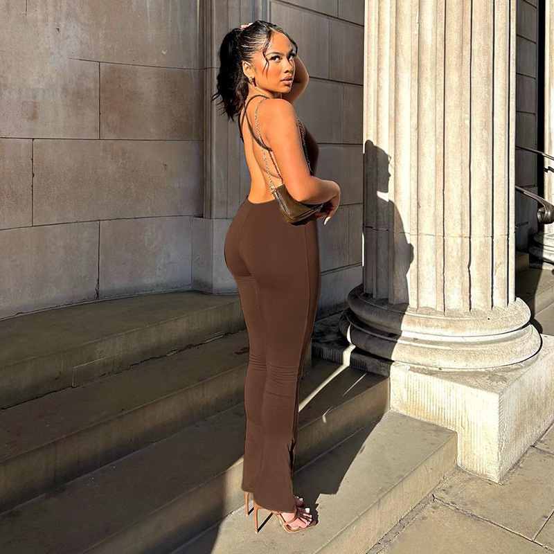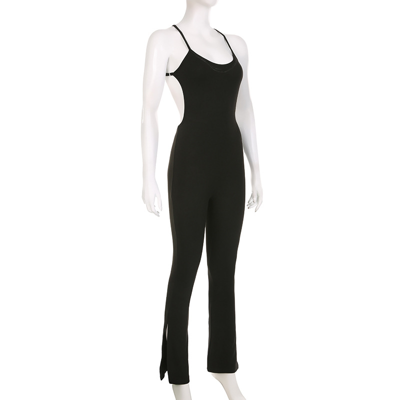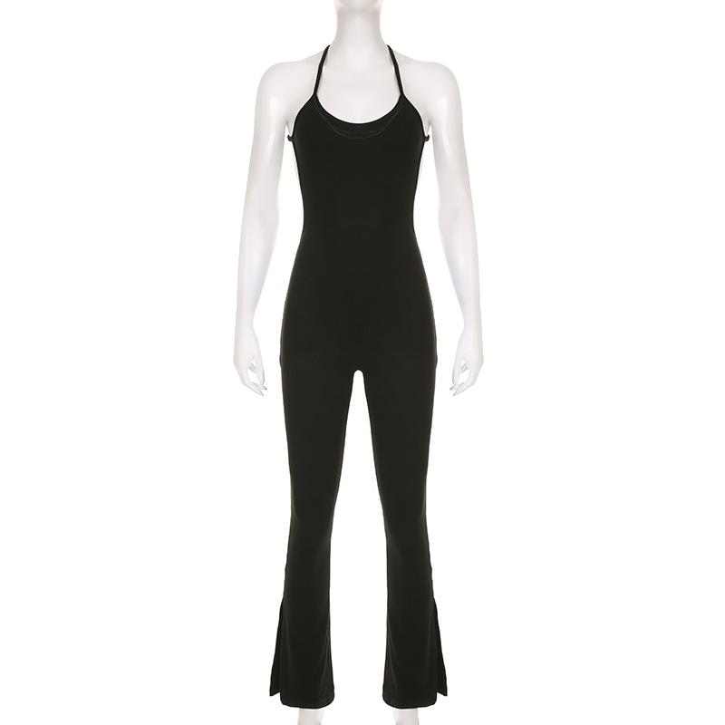 Women Solid Color Simple U Collar Halterneck With Suspenders Backless Tight Micro Pull Split Characteristic Jumpsuit Trousers