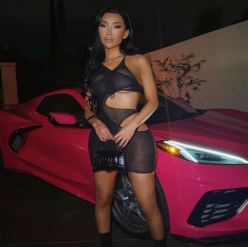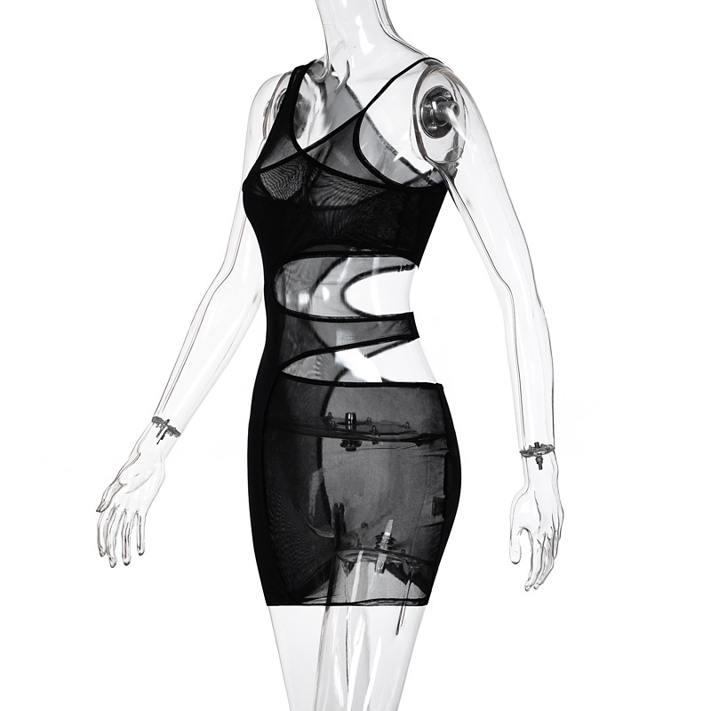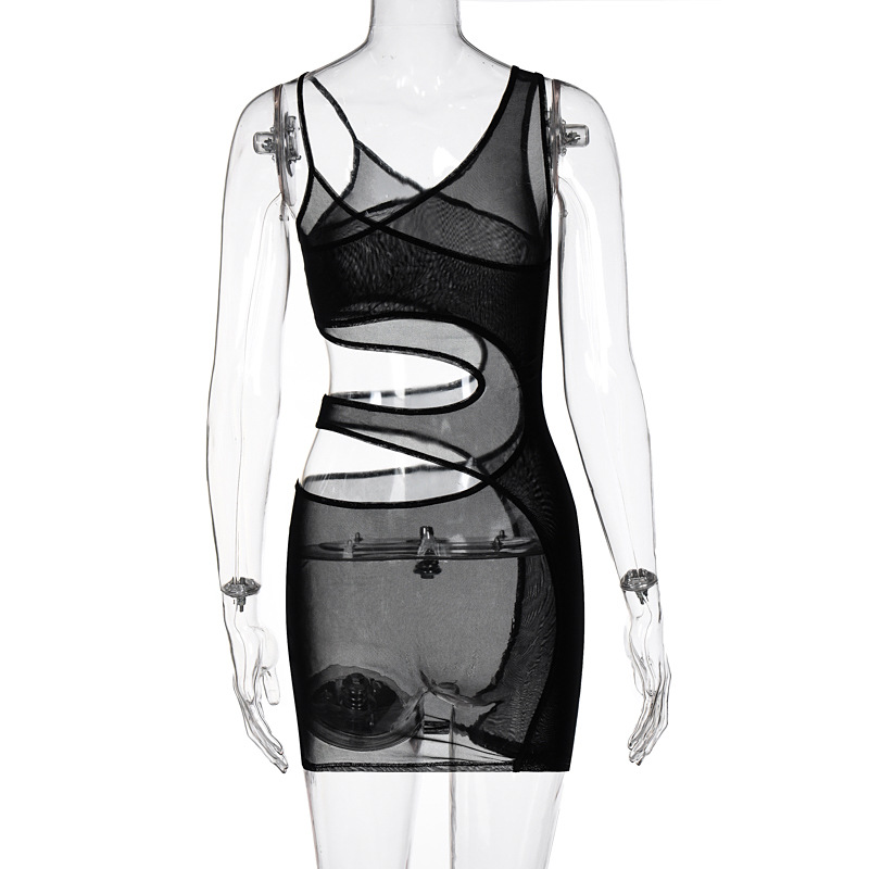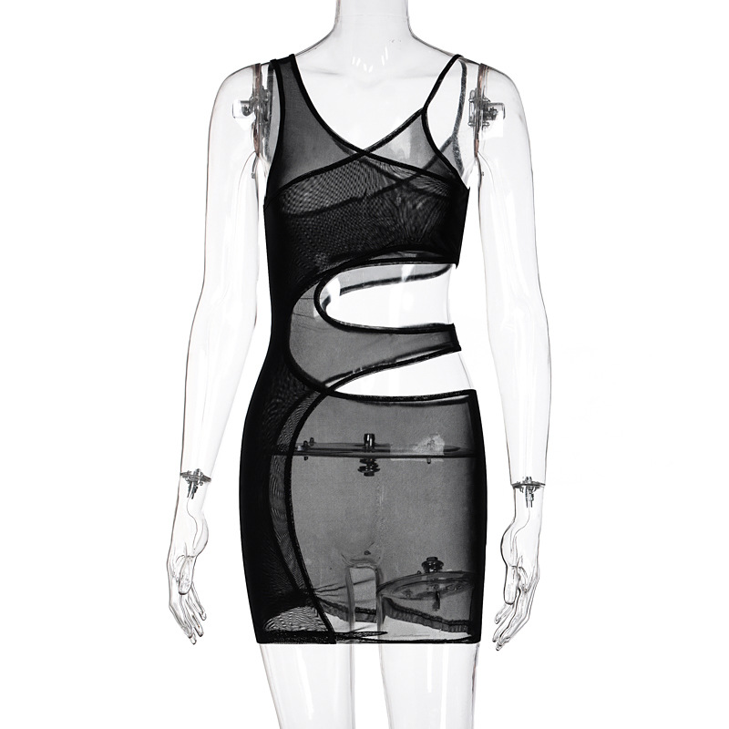 Women Spring sexy sling belt net gauze perspective side hollow-out dress